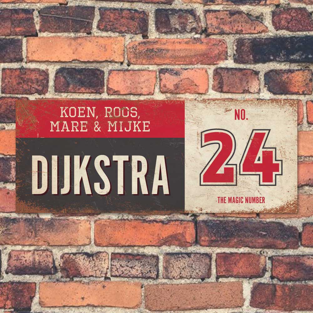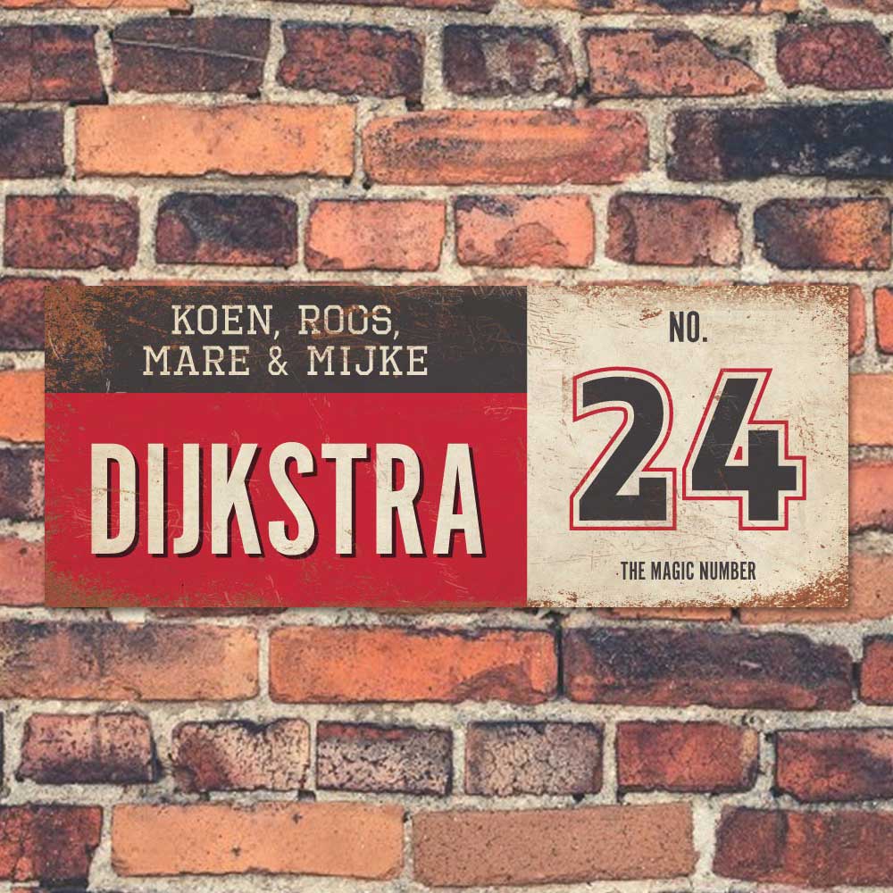 Mooi rood, zwart en wit “vintage” langwerpig naambordke met uw achternaam, voornamen en huisnummer. Stoer en origineel naambordje voor bij de voordeur van jouw huis. Maar natuurlijk ook leuk en origineel als cadeau voor iemand die net verhuisd is (housewarming).