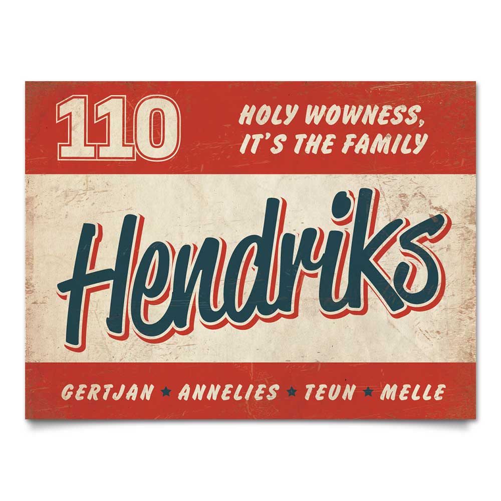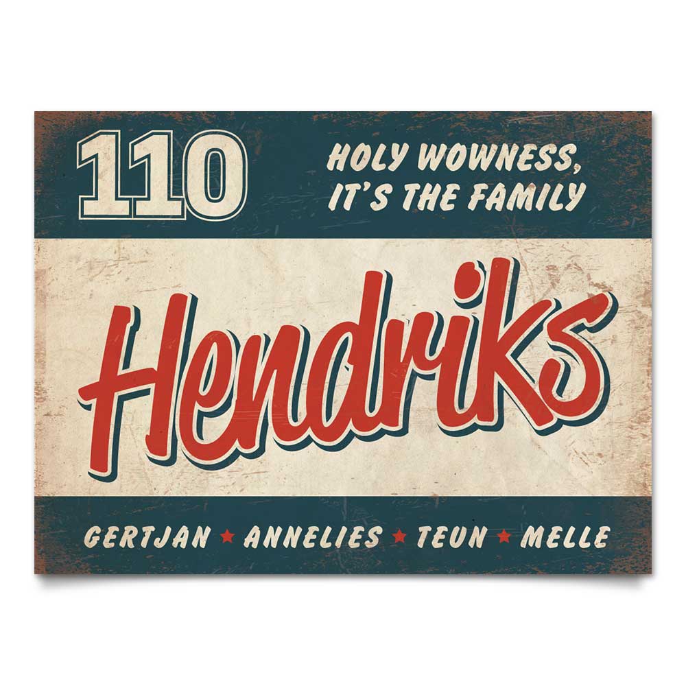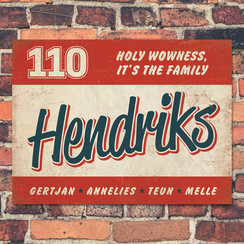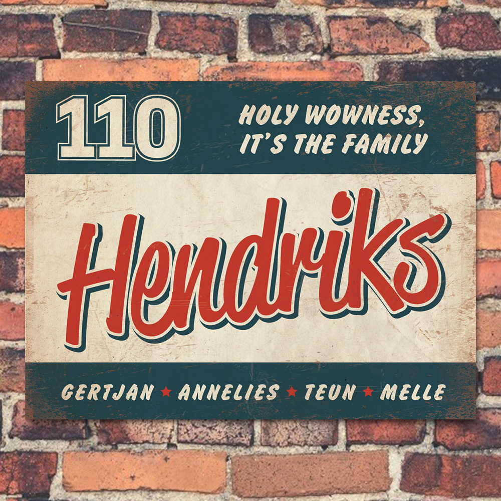 Mooi blauw,  rood en wit “vintage” naambordje (Engelstalig reclamebord) met jouw achternaam, voornamen, huisnummer en leuke teksten. Stoer en origineel naambordje voor bij de voordeur van jouw huis. Maar natuurlijk ook leuk en origineel als cadeau voor iemand die net verhuisd is (housewarming).