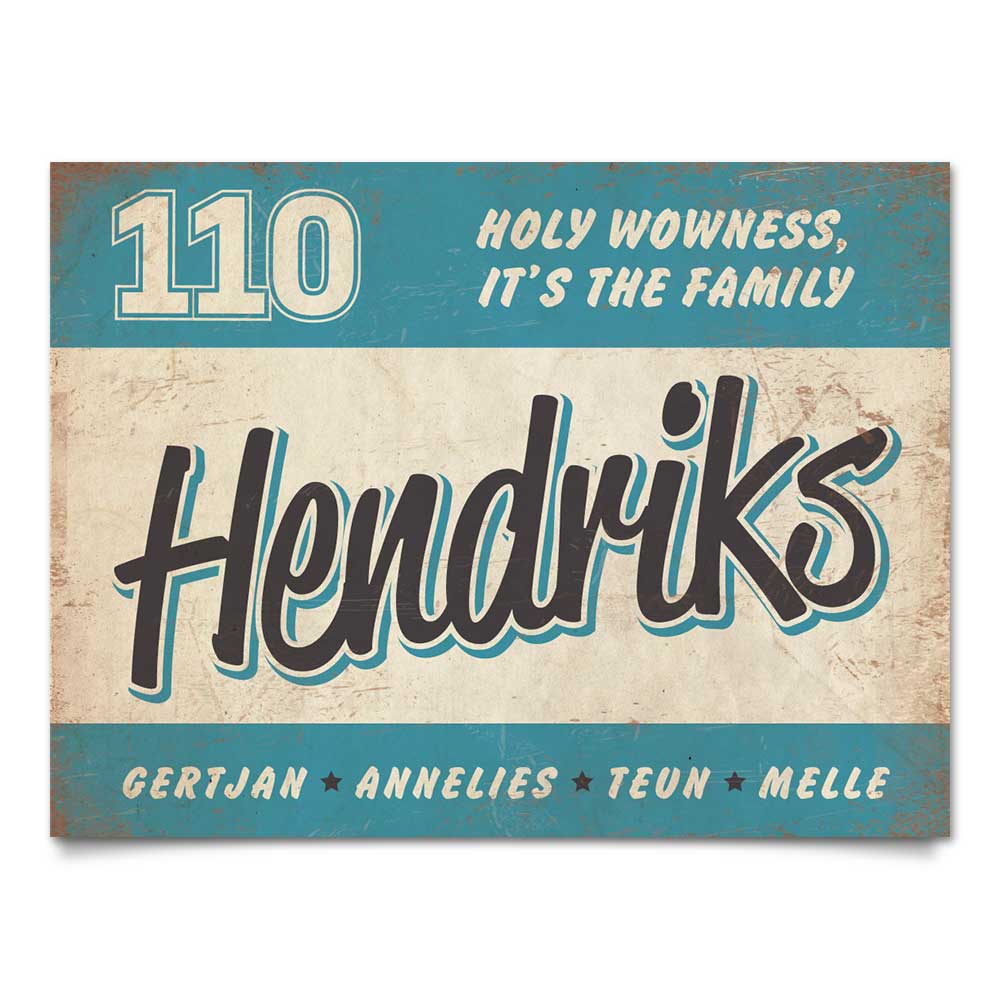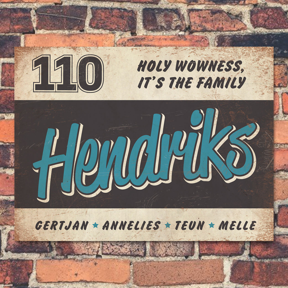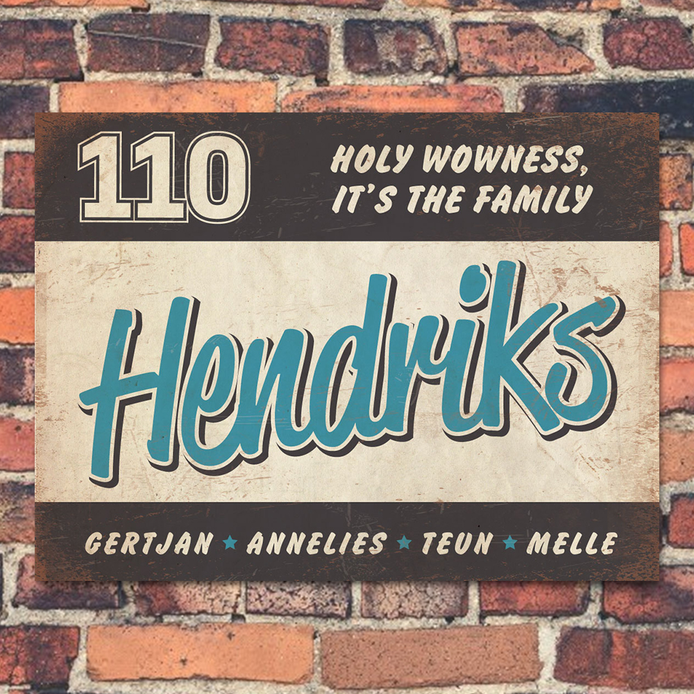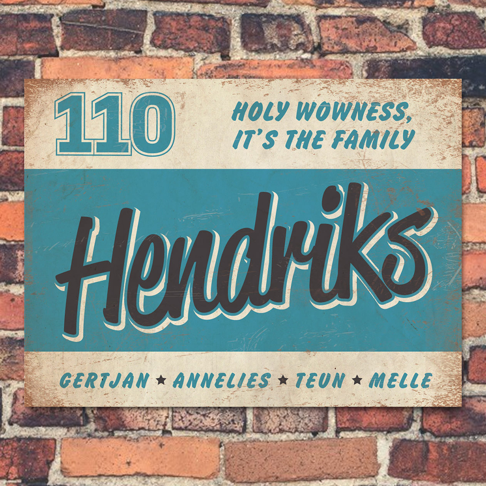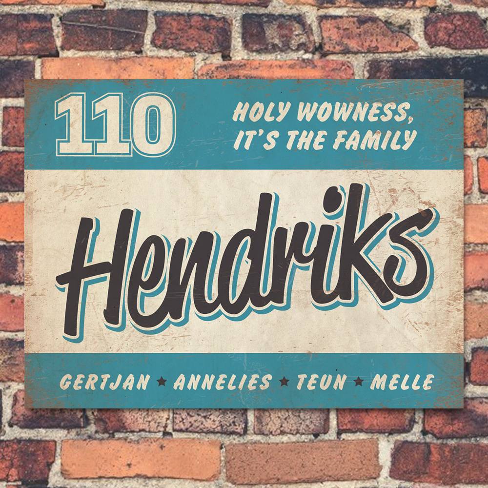 Mooi blauw,  zwart en wit “vintage” naambordje (Engelstalig reclamebord) met jouw achternaam, voornamen, huisnummer en leuke teksten. Stoer en origineel naambordje voor bij de voordeur van jouw huis. Maar natuurlijk ook leuk en origineel als cadeau voor iemand die net verhuisd is (housewarming).