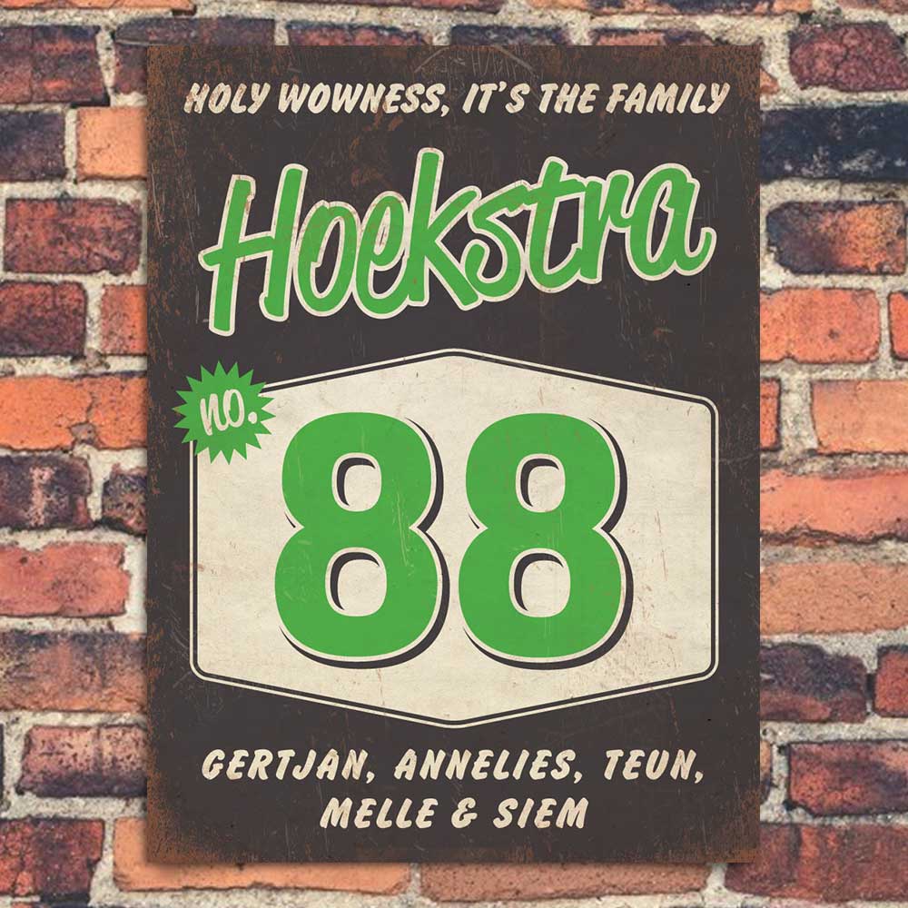 Mooi groen, zwart en wit “vintage” naambordje (Engelstalig reclamebord) met jouw achternaam, voornamen, huisnummer en leuke teksten. Stoer en origineel naambordje voor bij de voordeur van jouw huis. Maar natuurlijk ook leuk en origineel als cadeau voor iemand die net verhuisd is (housewarming).
