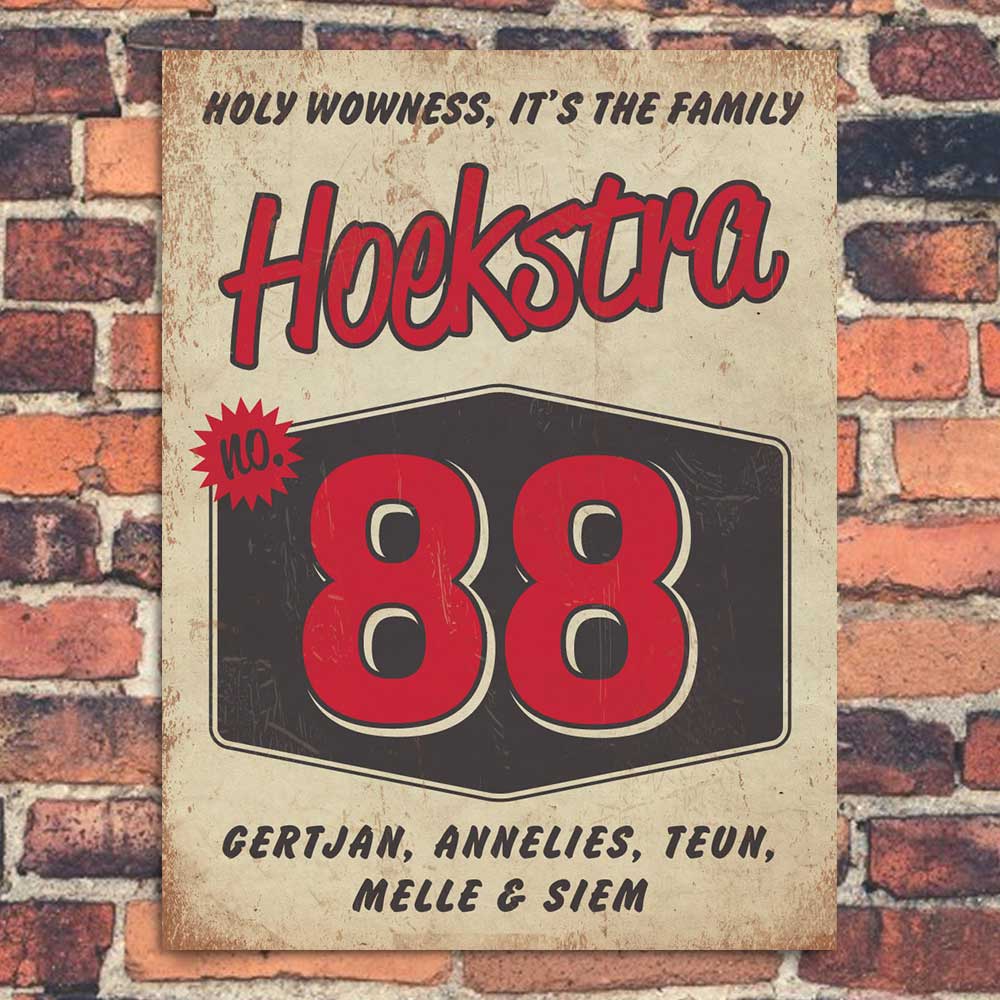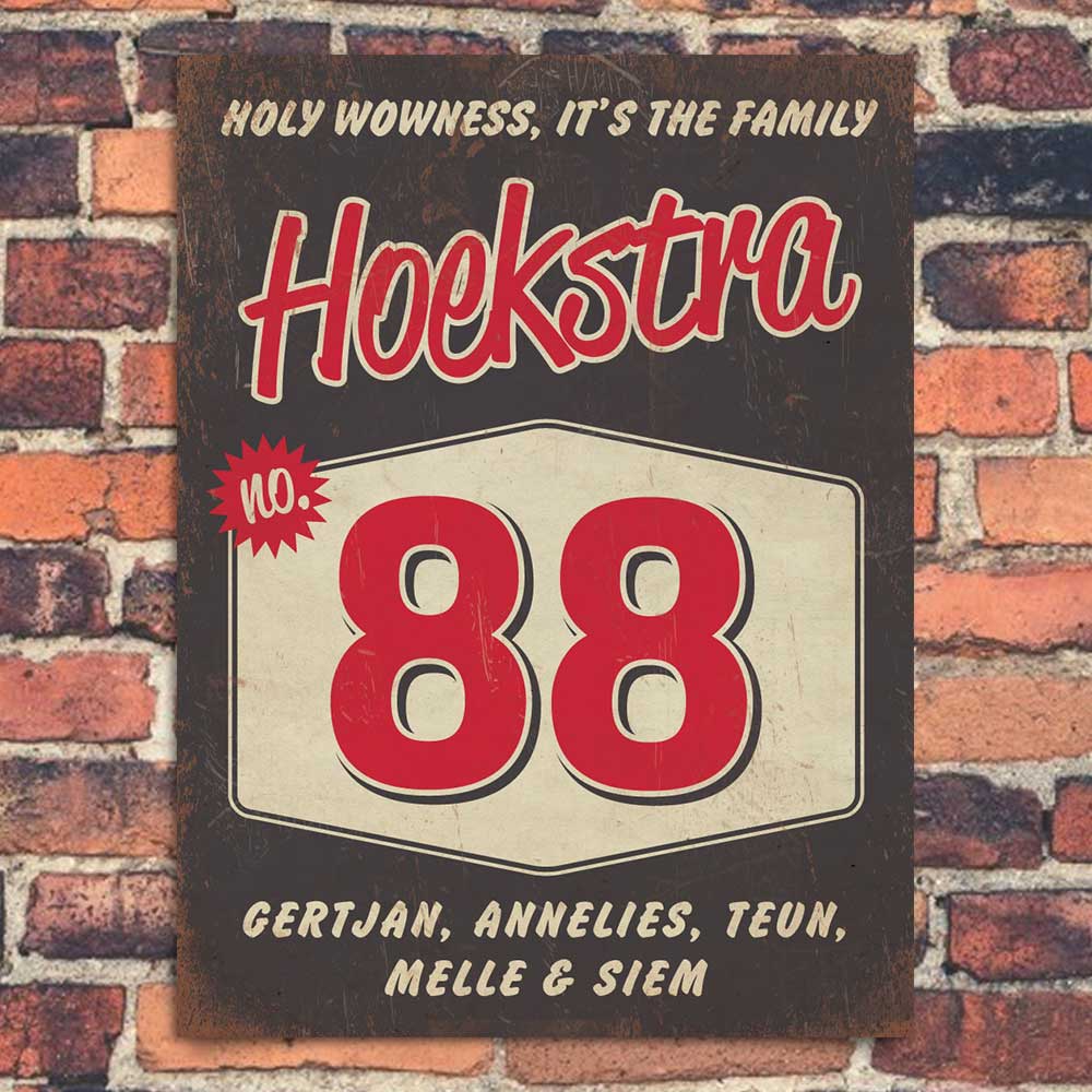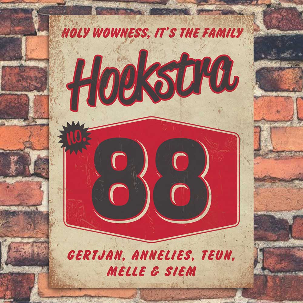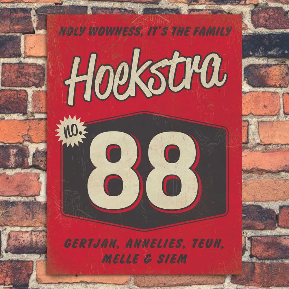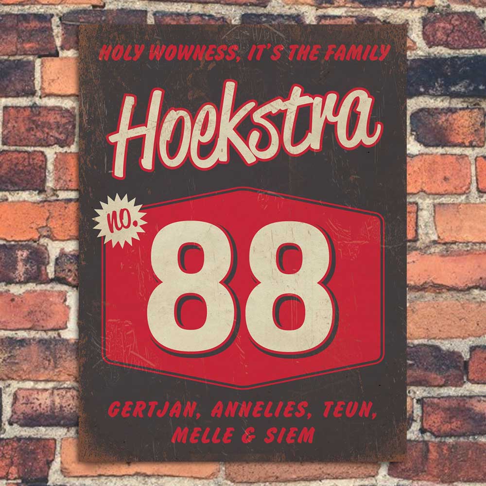 Mooi rood, zwart en wit “vintage” naambordje (Engelstalig reclamebord) met jouw achternaam, voornamen, huisnummer en leuke teksten. Stoer en origineel naambordje voor bij de voordeur van jouw huis. Maar natuurlijk ook leuk en origineel als cadeau voor iemand die net verhuisd is (housewarming).