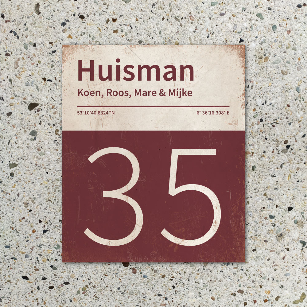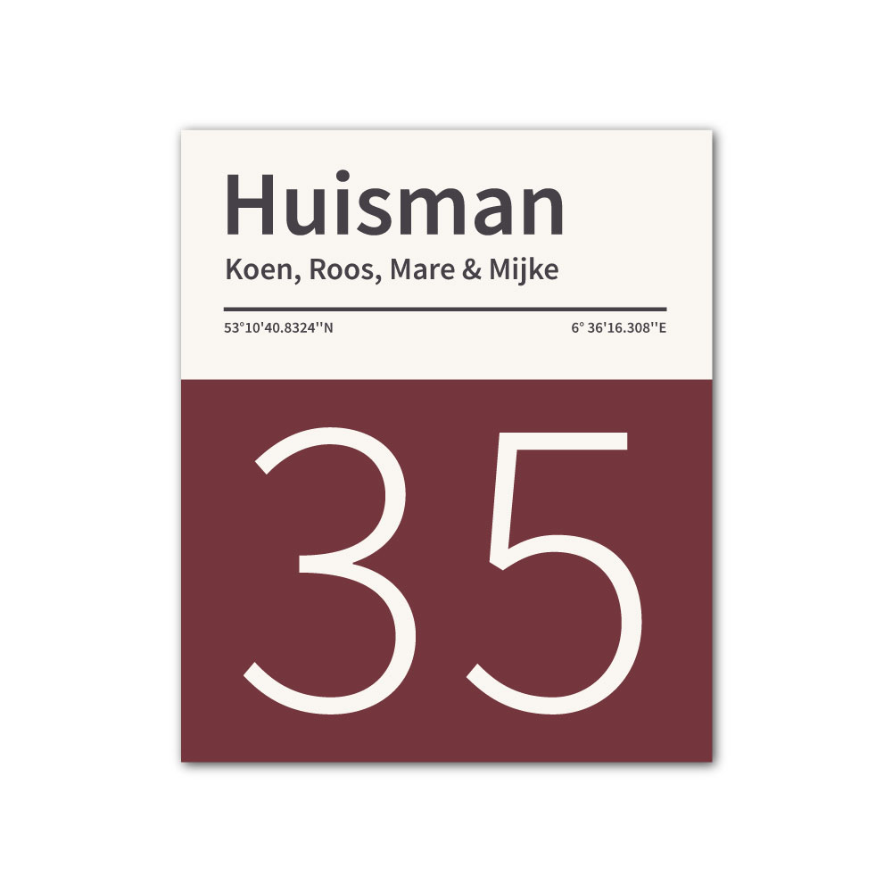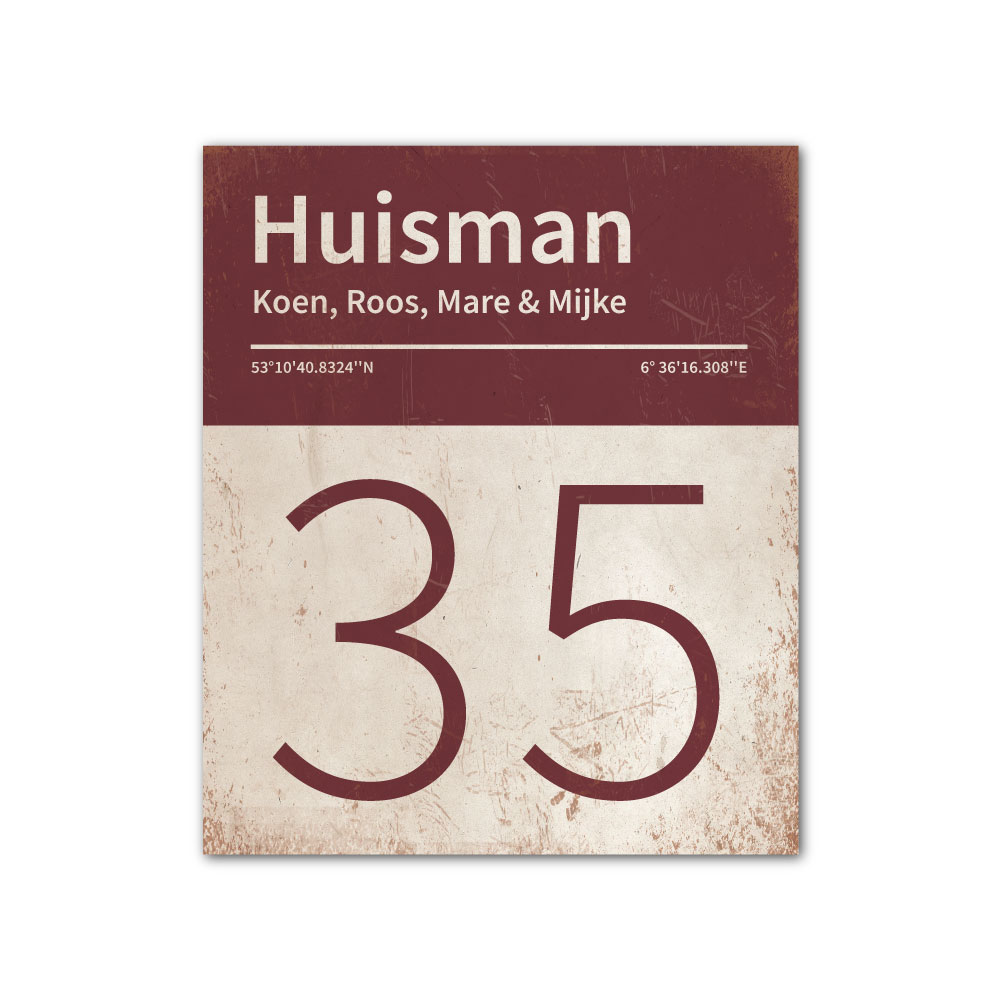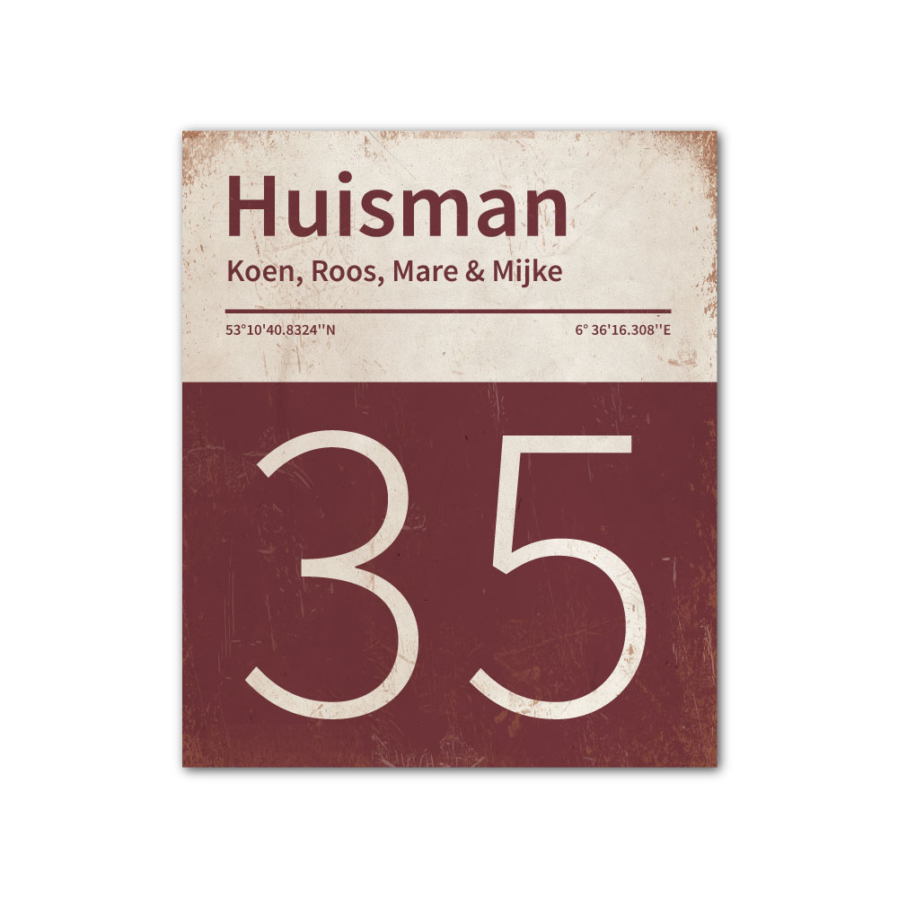 Mooi Bordeaux rode en wit “vintage” naambordje met jouw achternaam, voornamen, huisnummer en coördinaten. Gebaseerd op boekcovers uit de jaren zeventig en pantone kleurstalen. Strak en origineel naambordje voor bij de voordeur van jouw huis. Maar natuurlijk ook leuk en origineel als cadeau voor iemand die net verhuisd is (housewarming), voor de (nieuwe) mancave, tuinhuis, paardenstal, hondenhok etc.