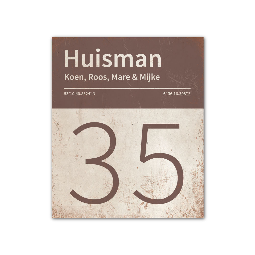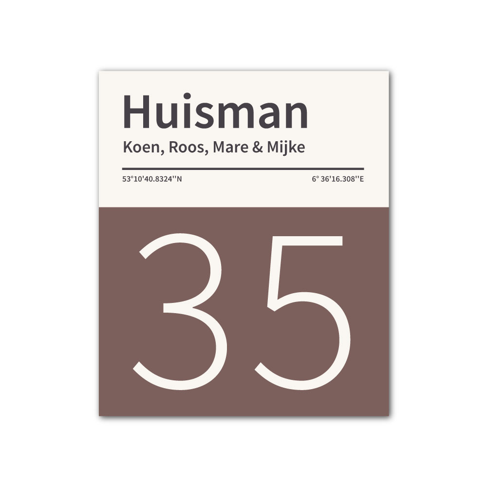 Mooi bruin en wit “vintage” naambordje met jouw achternaam, voornamen, huisnummer en coördinaten. Gebaseerd op boekcovers uit de jaren zeventig en pantone kleurstalen. Strak en origineel naambordje voor bij de voordeur van jouw huis. Maar natuurlijk ook leuk en origineel als cadeau voor iemand die net verhuisd is (housewarming), voor de (nieuwe) mancave, tuinhuis, paardenstal, hondenhok etc.