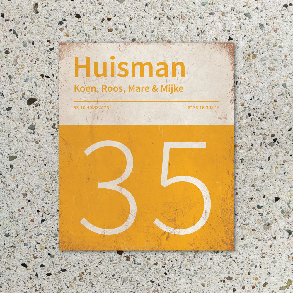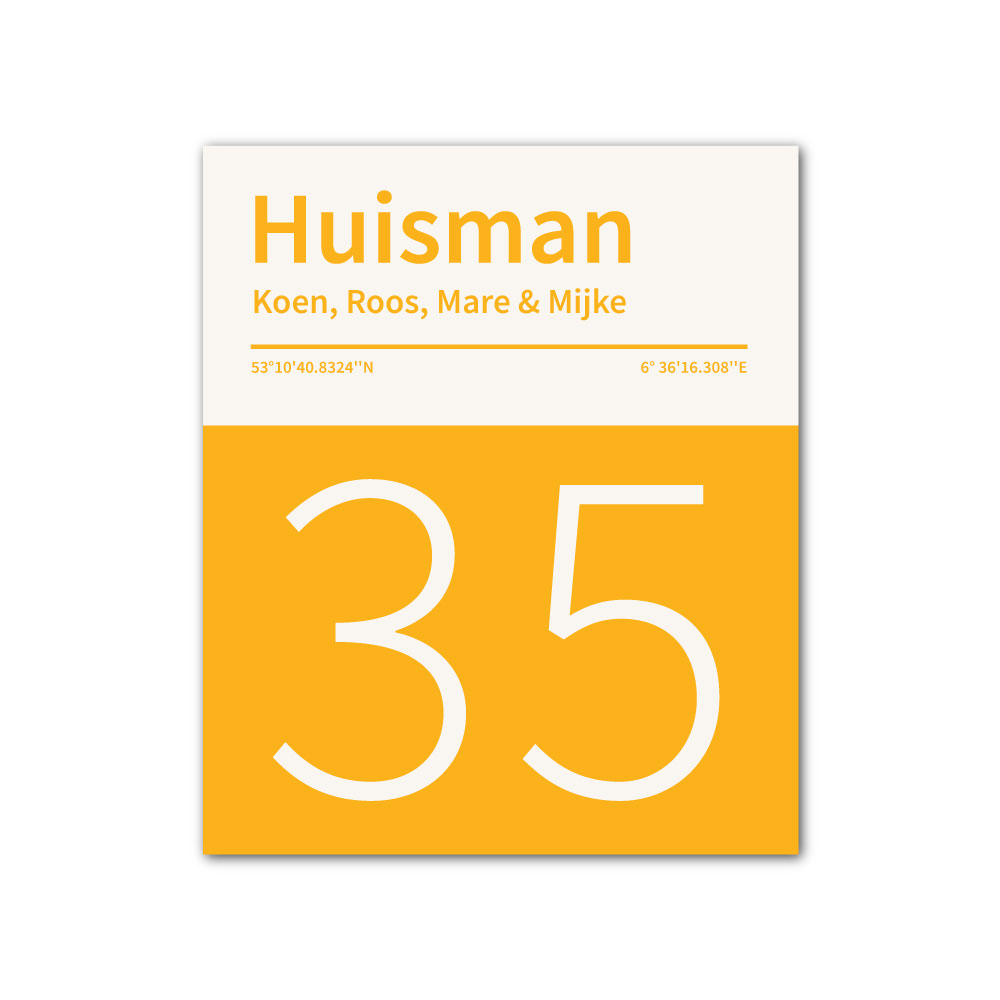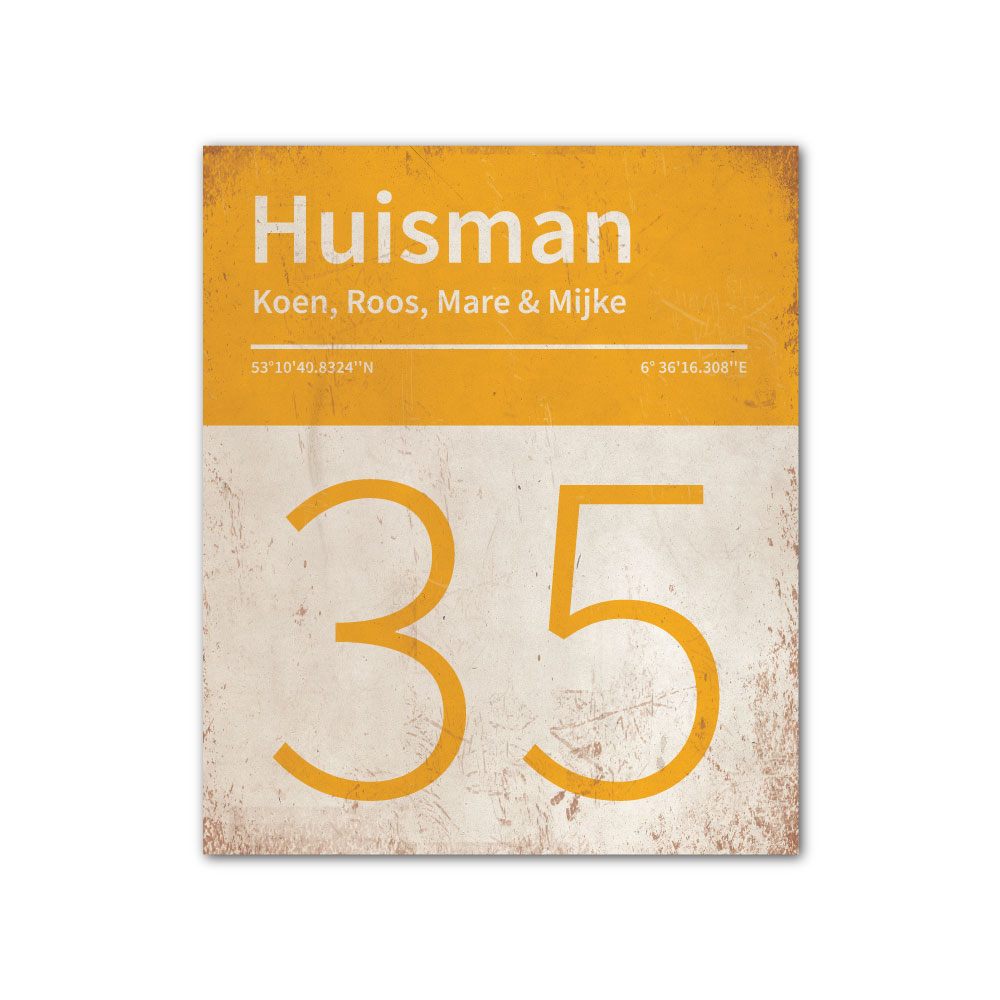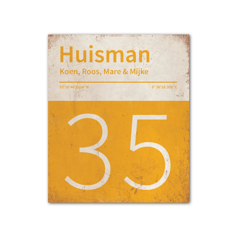 Mooi geel en wit “vintage” naambordje met jouw achternaam, voornamen, huisnummer en coördinaten. Gebaseerd op boekcovers uit de jaren zeventig en pantone kleurstalen. Strak en origineel naambordje voor bij de voordeur van jouw huis. Maar natuurlijk ook leuk en origineel als cadeau voor iemand die net verhuisd is (housewarming), voor de (nieuwe) mancave, tuinhuis, paardenstal, hondenhok etc.