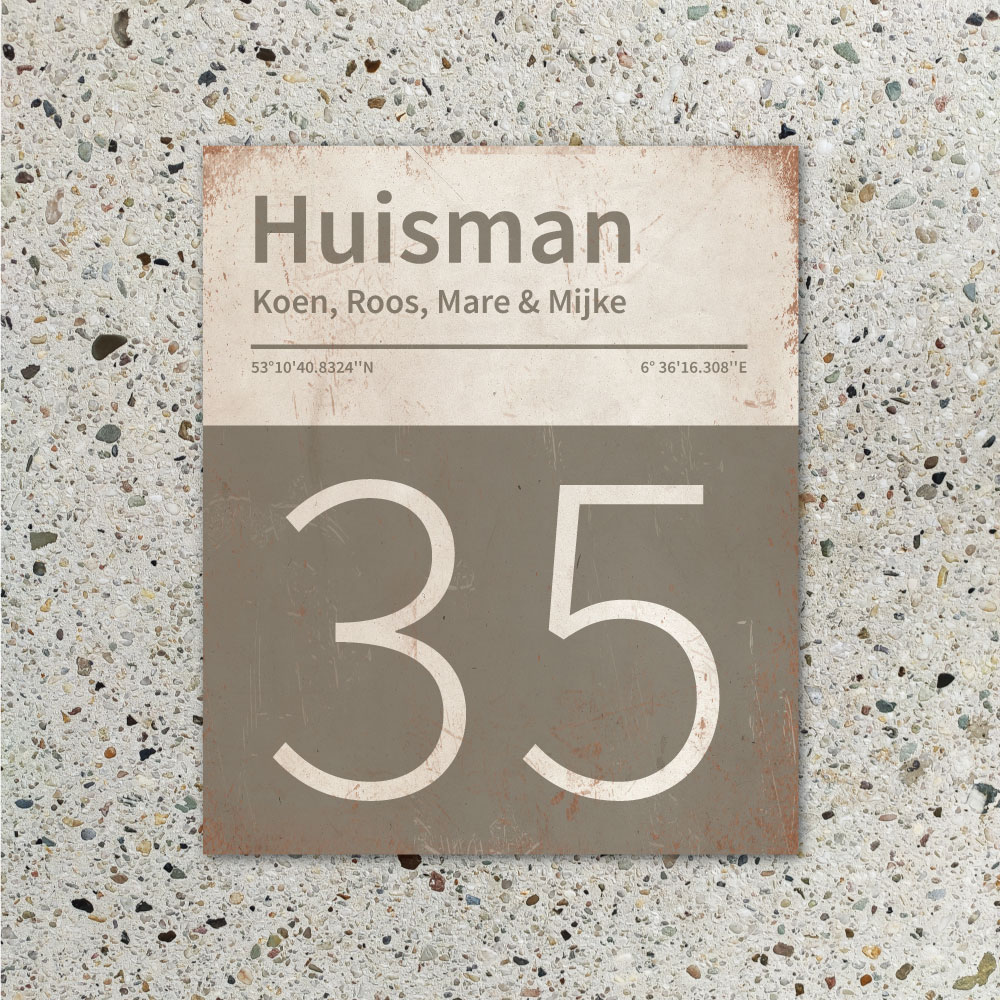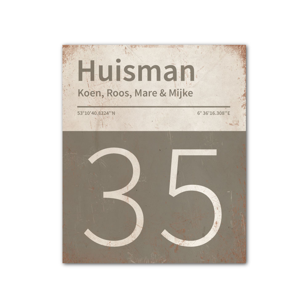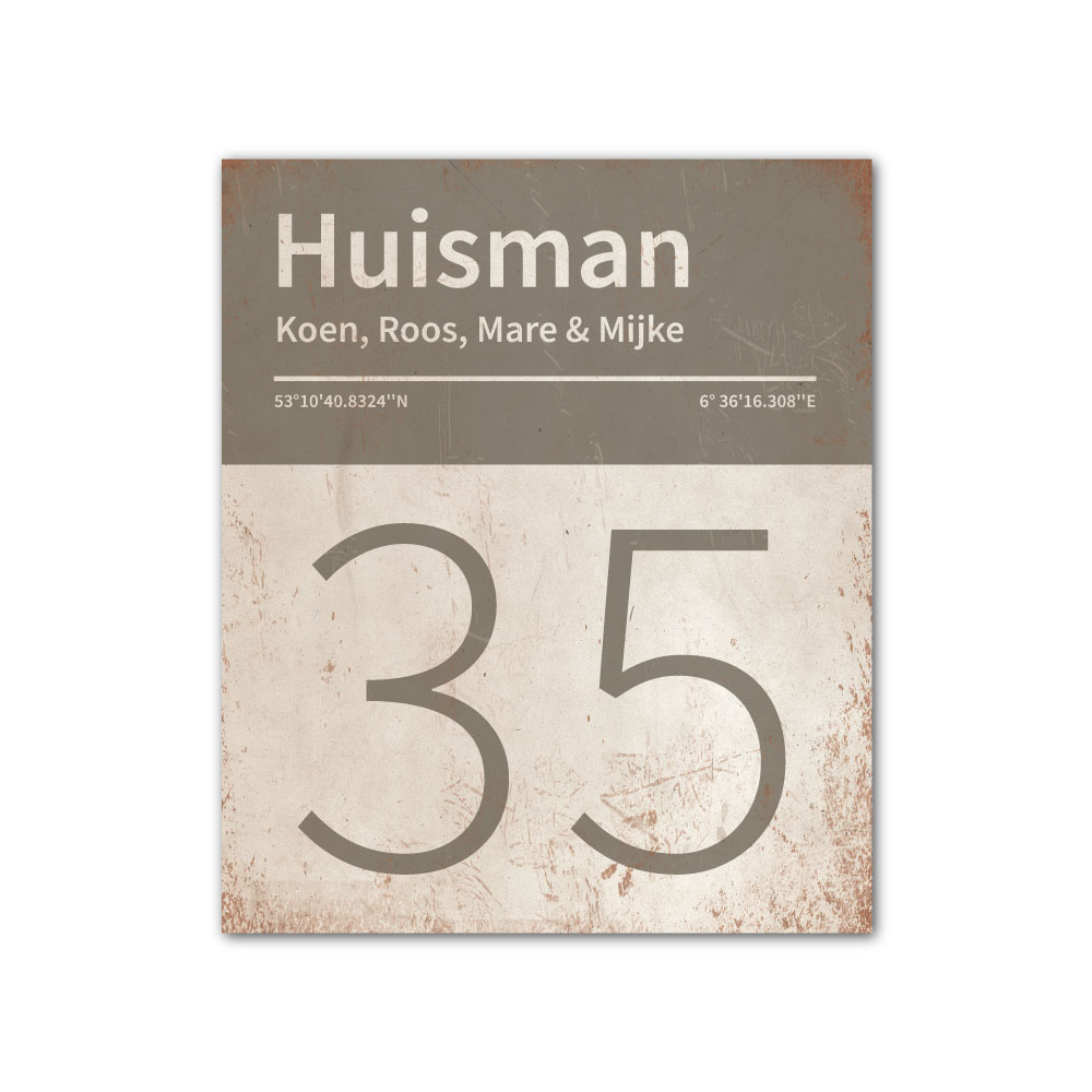 Mooi grijs en wit “vintage” naambordje met jouw achternaam, voornamen, huisnummer en coördinaten. Gebaseerd op boekcovers uit de jaren zeventig en pantone kleurstalen. Strak en origineel naambordje voor bij de voordeur van jouw huis. Maar natuurlijk ook leuk en origineel als cadeau voor iemand die net verhuisd is (housewarming), voor de (nieuwe) mancave, tuinhuis, paardenstal, hondenhok etc.
