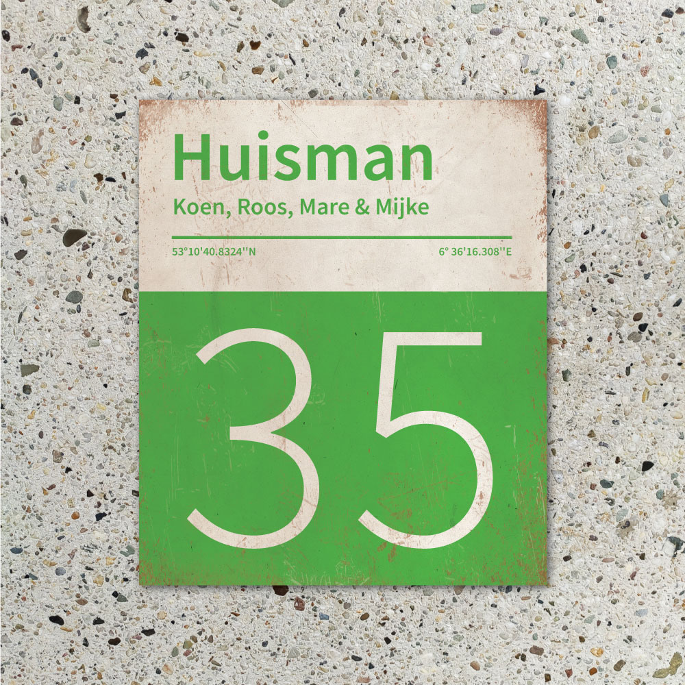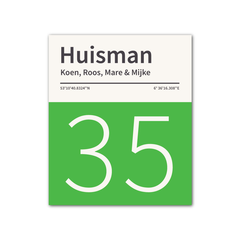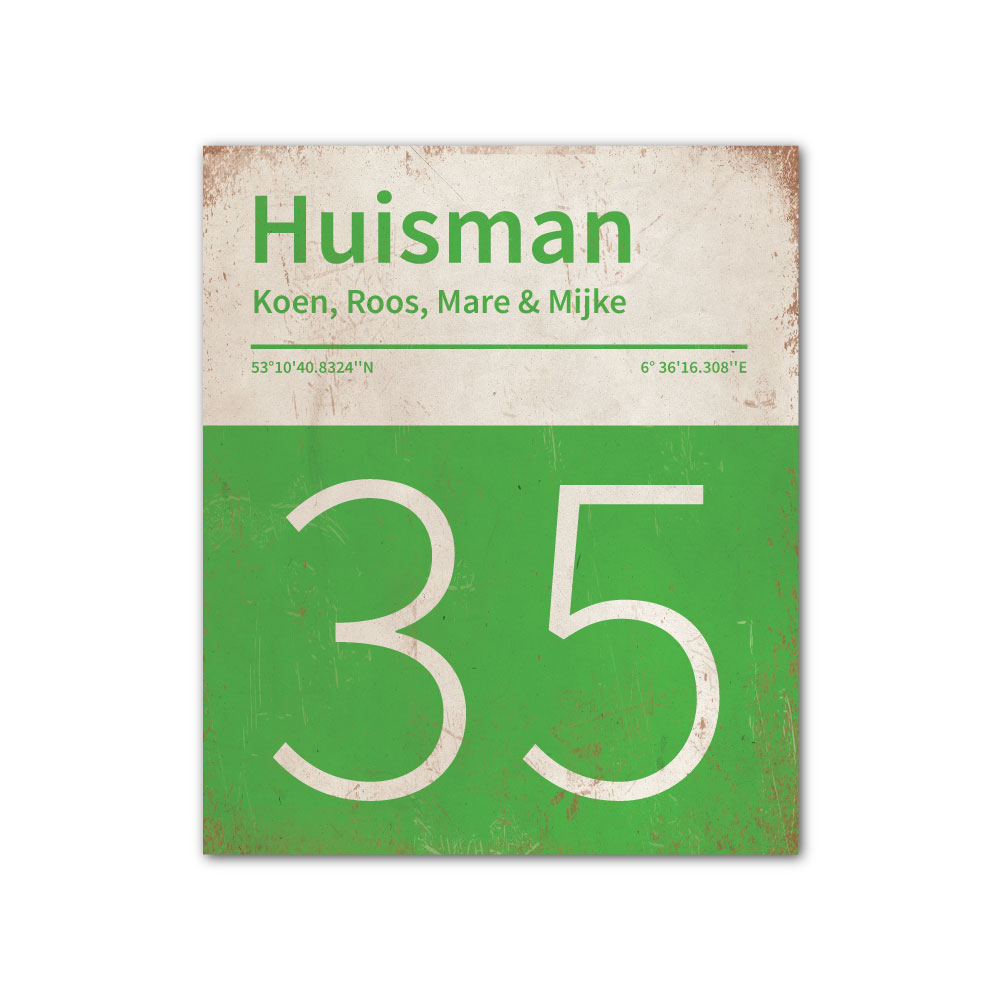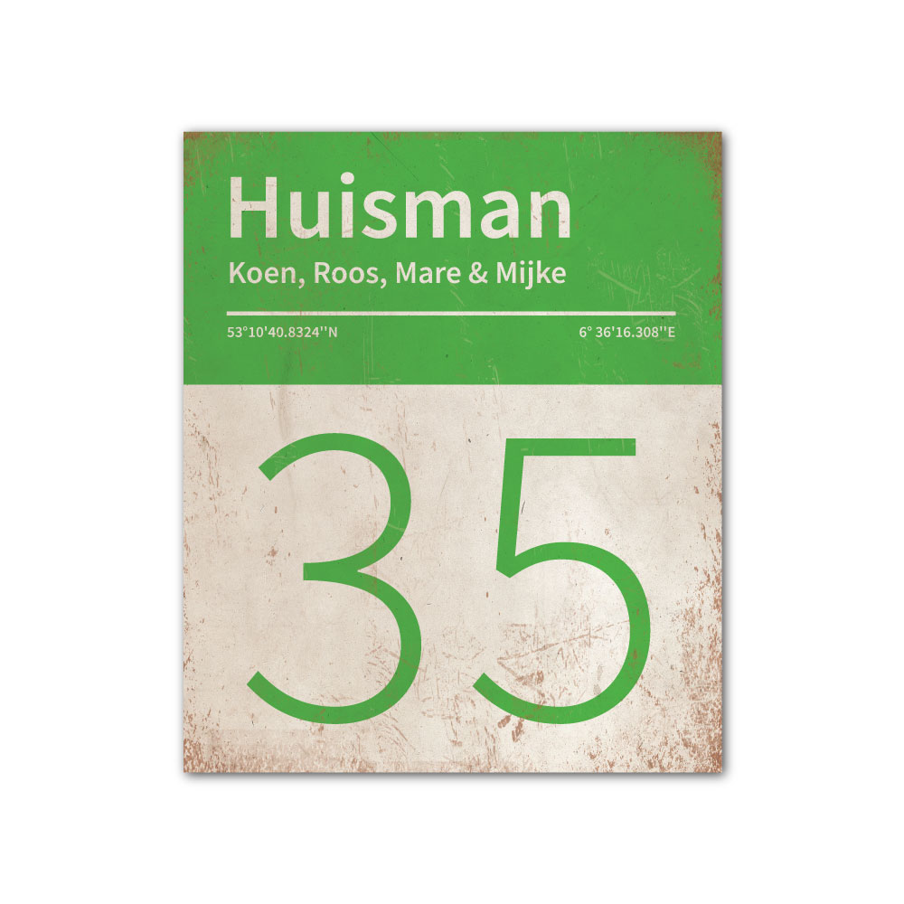 Mooi groen en wit “vintage” naambordje met jouw achternaam, voornamen, huisnummer en coördinaten. Gebaseerd op boekcovers uit de jaren zeventig en pantone kleurstalen. Strak en origineel naambordje voor bij de voordeur van jouw huis. Maar natuurlijk ook leuk en origineel als cadeau voor iemand die net verhuisd is (housewarming), voor de (nieuwe) mancave, tuinhuis, paardenstal, hondenhok etc.