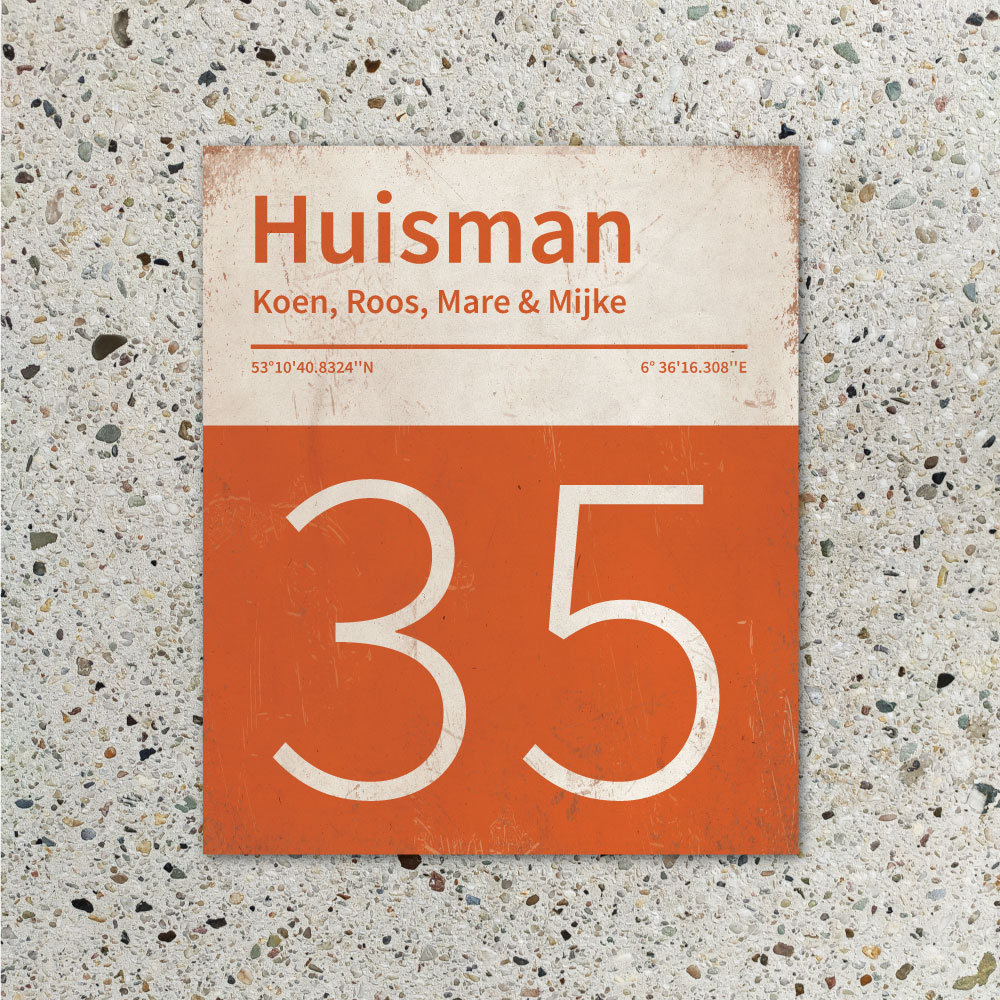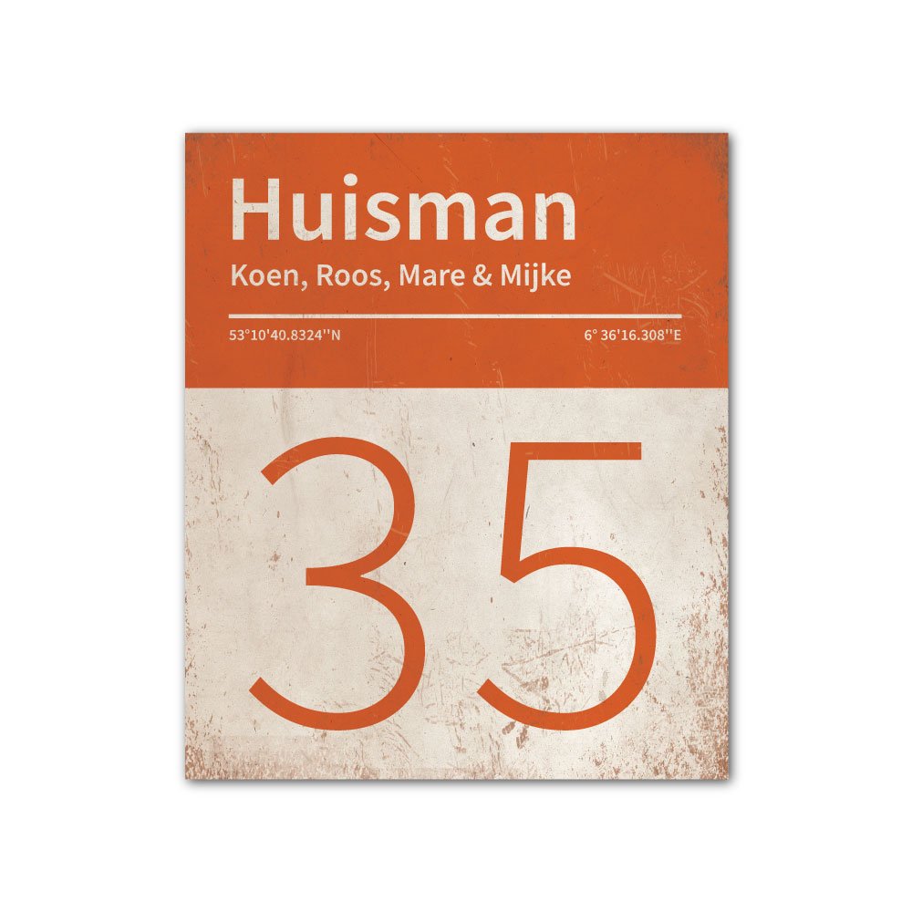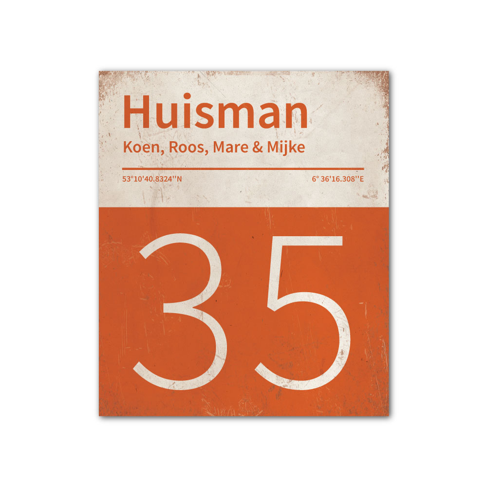 Mooi oranje en wit “vintage” naambordje met jouw achternaam, voornamen, huisnummer en coördinaten. Gebaseerd op boekcovers uit de jaren zeventig en pantone kleurstalen. Strak en origineel naambordje voor bij de voordeur van jouw huis. Maar natuurlijk ook leuk en origineel als cadeau voor iemand die net verhuisd is (housewarming), voor de (nieuwe) mancave, tuinhuis, paardenstal, hondenhok etc.