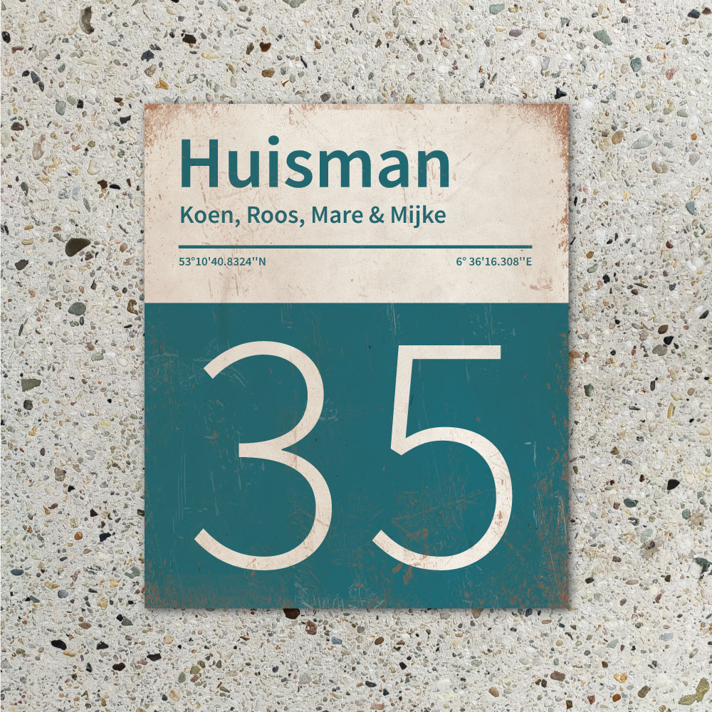 Mooi petrol blauw en wit “vintage” naambordje met jouw achternaam, voornamen, huisnummer en coördinaten. Gebaseerd op boekcovers uit de jaren zeventig en pantone kleurstalen. Strak en origineel naambordje voor bij de voordeur van jouw huis. Maar natuurlijk ook leuk en origineel als cadeau voor iemand die net verhuisd is (housewarming), voor de (nieuwe) mancave, tuinhuis, paardenstal, hondenhok etc.