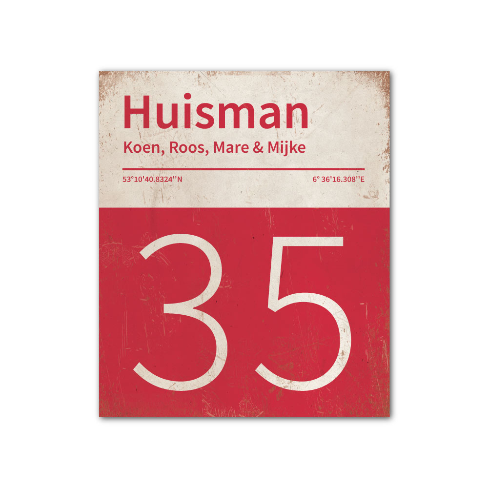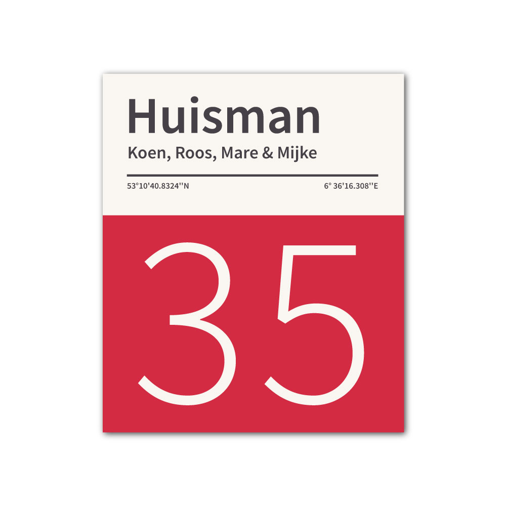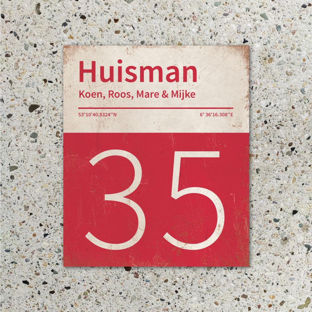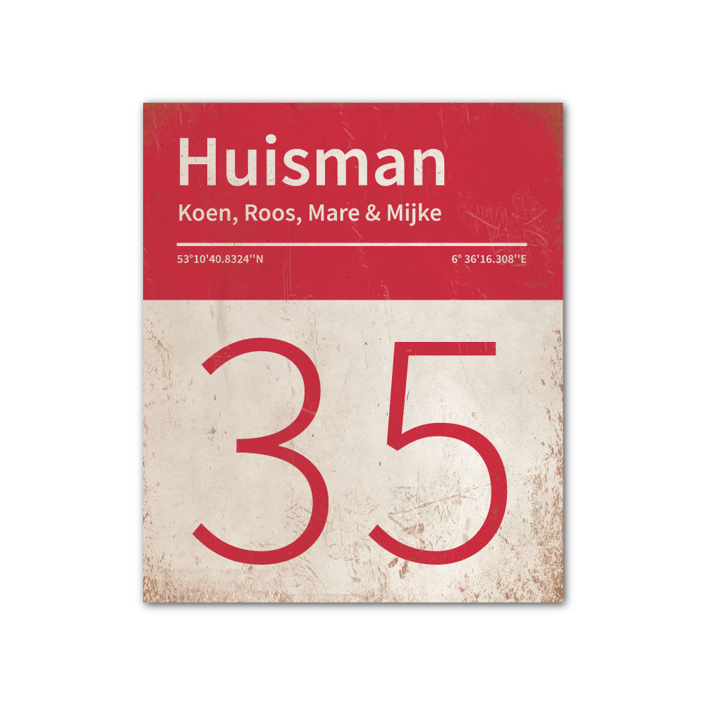 Mooi rood en wit “vintage” naambordje met jouw achternaam, voornamen, huisnummer en coördinaten. Gebaseerd op boekcovers uit de jaren zeventig en pantone kleurstalen. Strak en origineel naambordje voor bij de voordeur van jouw huis. Maar natuurlijk ook leuk en origineel als cadeau voor iemand die net verhuisd is (housewarming), voor de (nieuwe) mancave, tuinhuis, paardenstal, hondenhok etc.