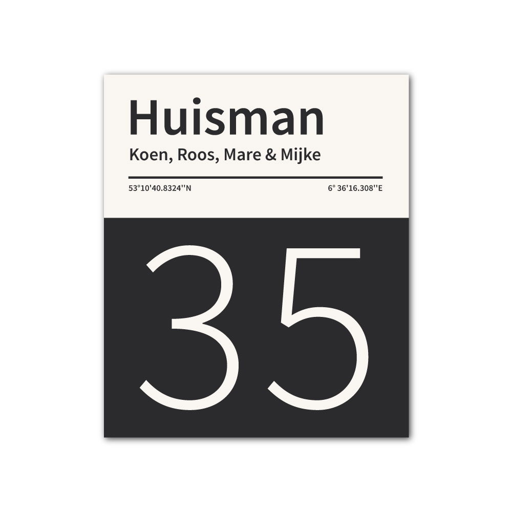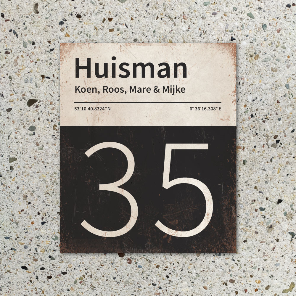 Mooi antraciet en wit “vintage” naambordje met jouw achternaam, voornamen, huisnummer en coördinaten. Gebaseerd op boekcovers uit de jaren zeventig en pantone kleurstalen. Strak en origineel naambordje voor bij de voordeur van jouw huis. Maar natuurlijk ook leuk en origineel als cadeau voor iemand die net verhuisd is (housewarming), voor de (nieuwe) mancave, tuinhuis, paardenstal, hondenhok etc.