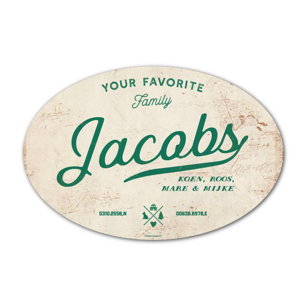Mooi groen en wit “vintage” ovaal naambordje met jouw achternaam, voornamen, coördinaten en huisnummer. Geïnspireerd door oude borden. Stoer en origineel naambordje voor bij de voordeur van jouw huis. Maar natuurlijk ook leuk en origineel als cadeau voor iemand die net verhuisd is (housewarming), voor de (nieuwe) mancave.