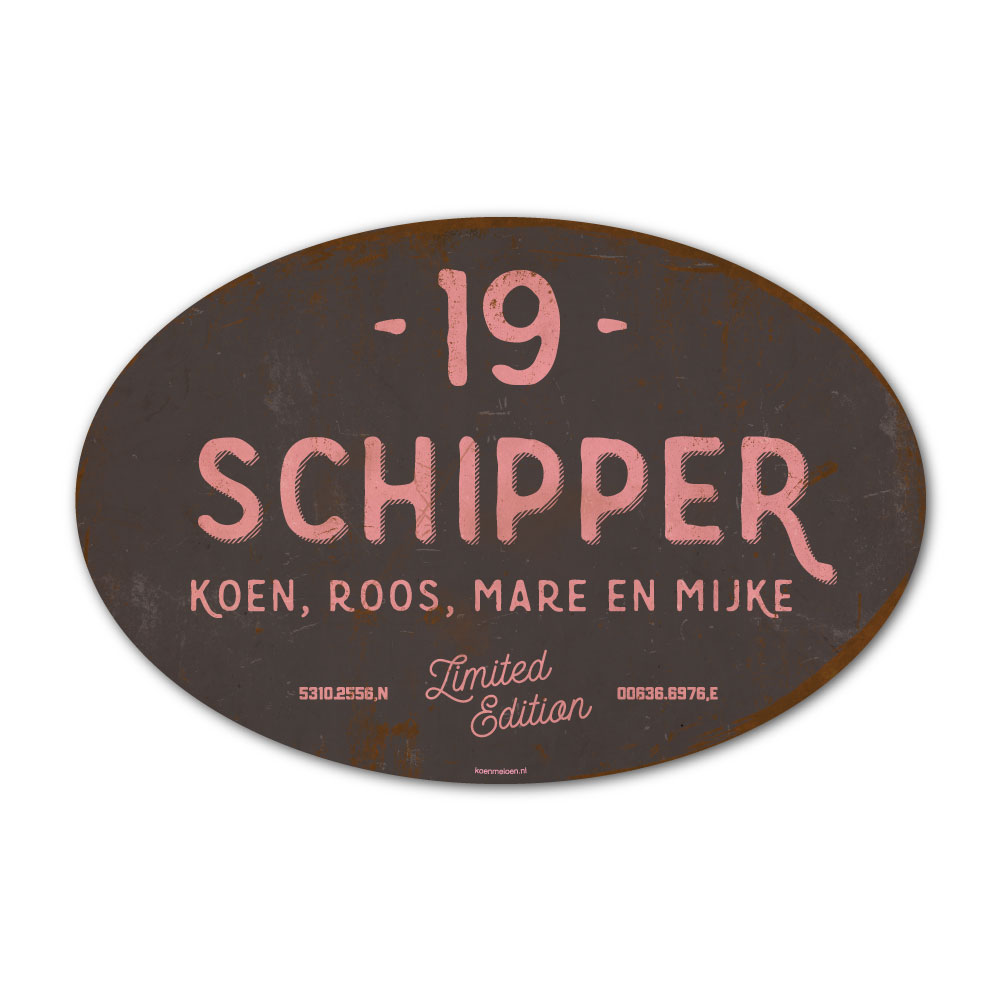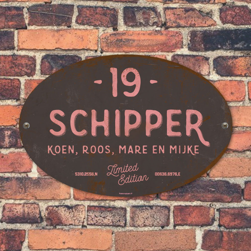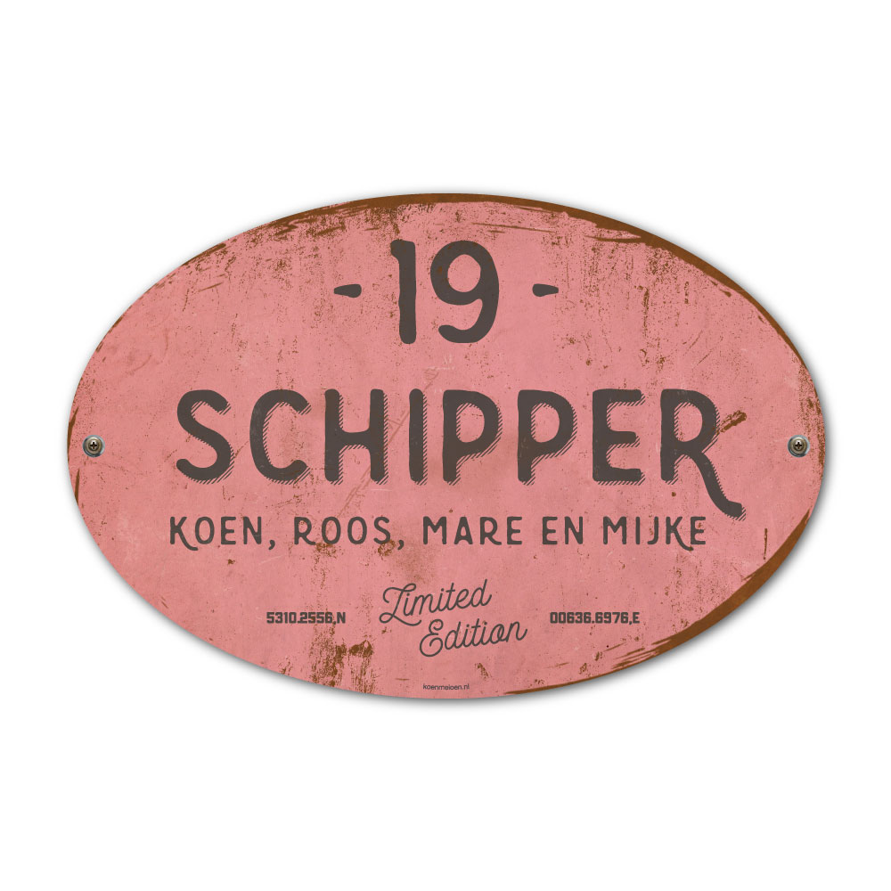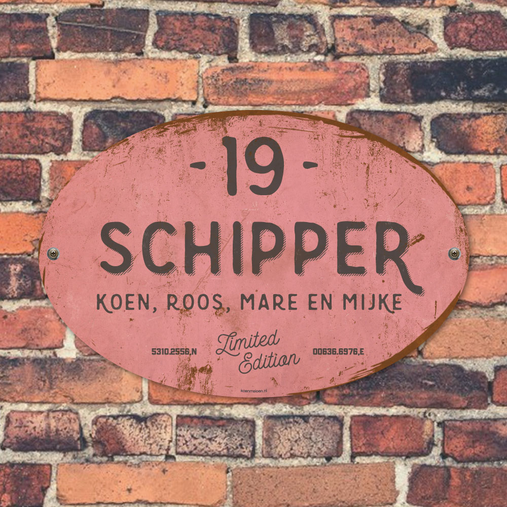 Mooi antraciet en roze “vintage” ovaal naambordje met jouw achternaam, voornamen, coördinaten en huisnummer. Geïnspireerd door oude borden. Stoer en origineel naambordje voor bij de voordeur van jouw huis. Maar natuurlijk ook leuk en origineel als cadeau voor iemand die net verhuisd is (housewarming), voor de (nieuwe) mancave.