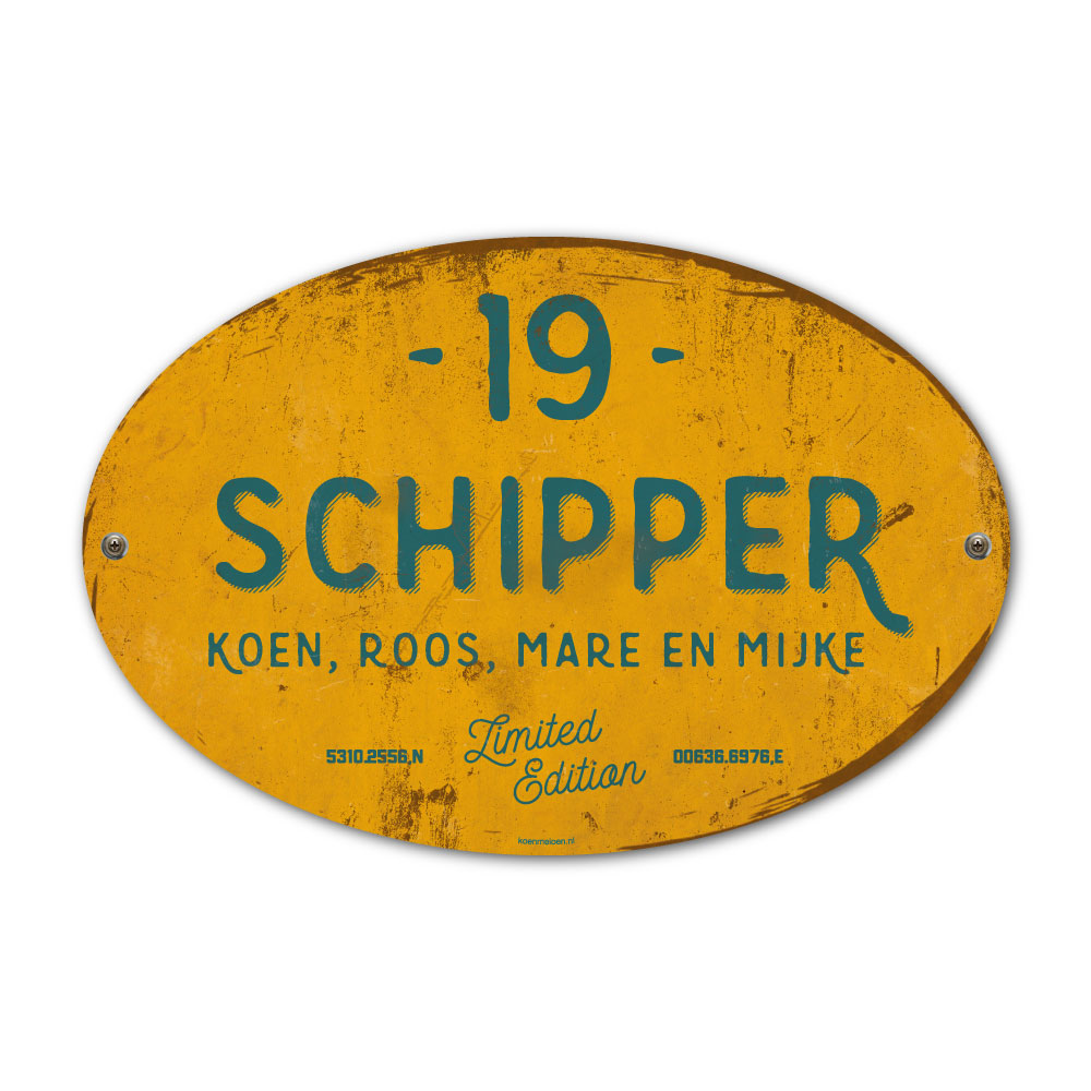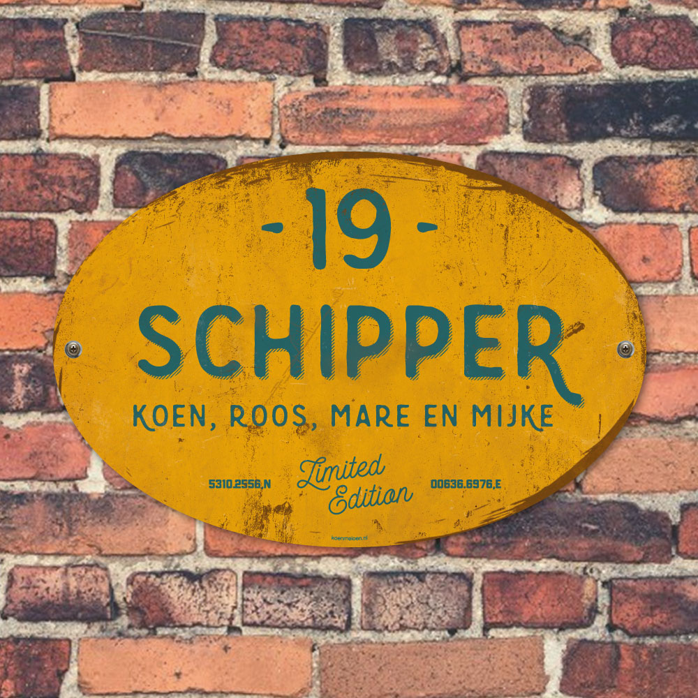 Mooi petrol-blue en geel “vintage” ovaal naambordje met jouw achternaam, voornamen, coördinaten en huisnummer. Geïnspireerd door oude borden. Stoer en origineel naambordje voor bij de voordeur van jouw huis. Maar natuurlijk ook leuk en origineel als cadeau voor iemand die net verhuisd is (housewarming), voor de (nieuwe) mancave.