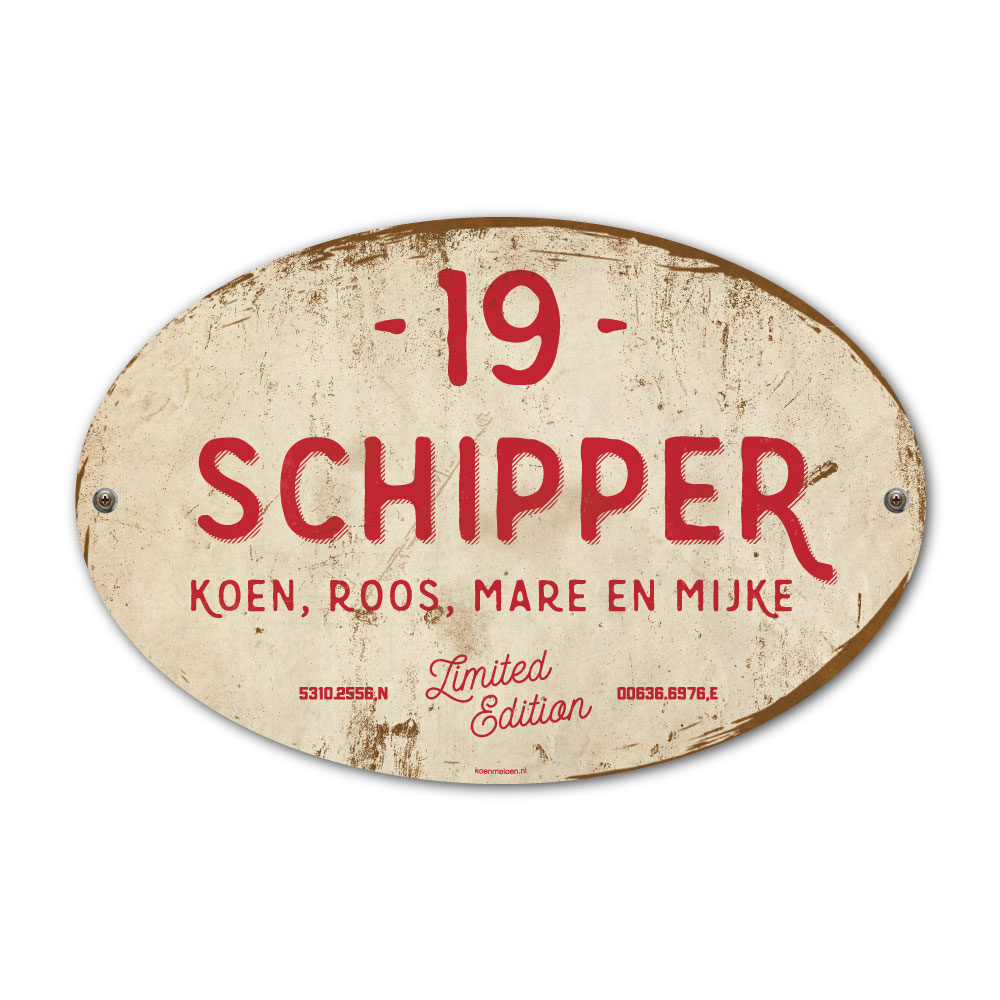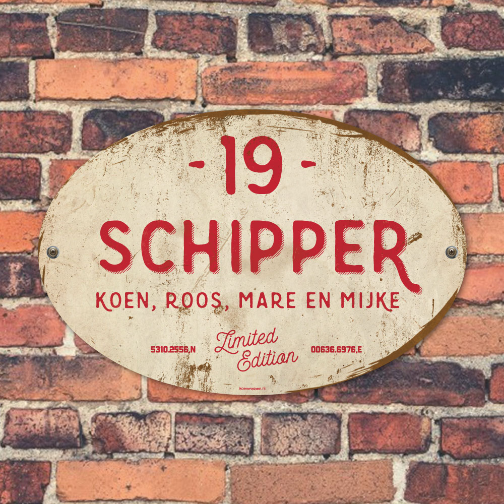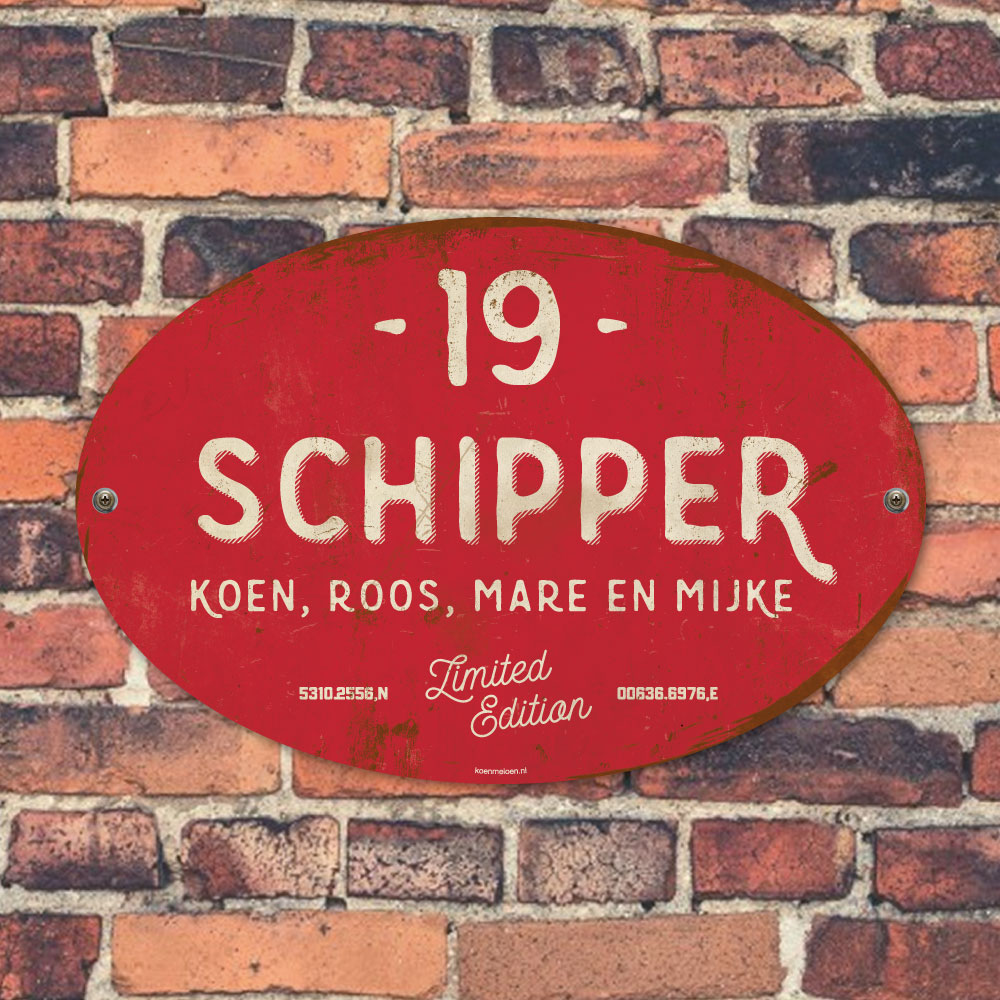 Mooi rood en wit “vintage” ovaal naambordje met jouw achternaam, voornamen, coördinaten en huisnummer. Geïnspireerd door oude borden. Stoer en origineel naambordje voor bij de voordeur van jouw huis. Maar natuurlijk ook leuk en origineel als cadeau voor iemand die net verhuisd is (housewarming), voor de (nieuwe) mancave.