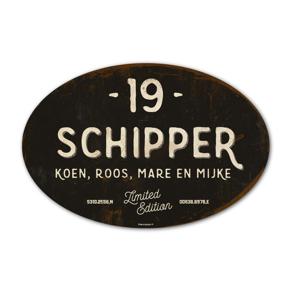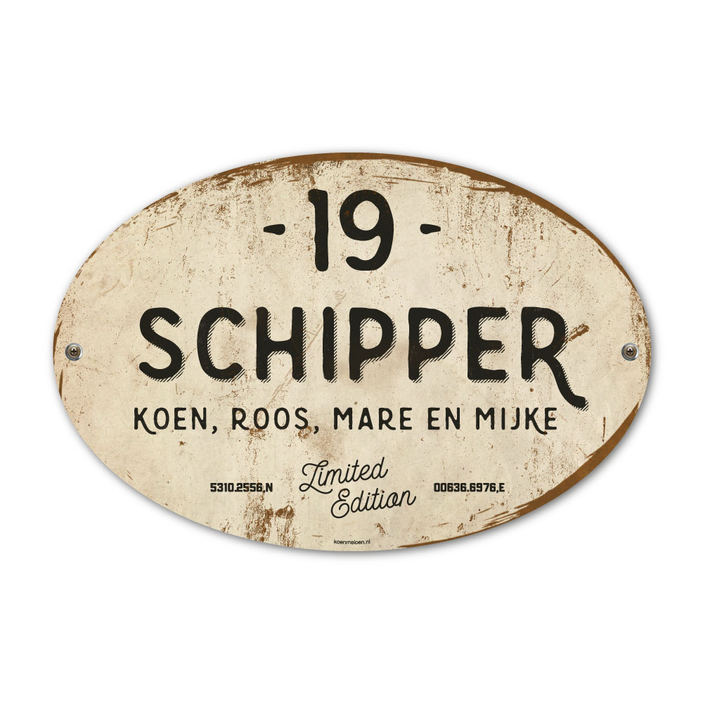 Mooi zwart en wit “vintage” ovaal naambordje met jouw achternaam, voornamen, coördinaten en huisnummer. Geïnspireerd door oude borden. Stoer en origineel naambordje voor bij de voordeur van jouw huis. Maar natuurlijk ook leuk en origineel als cadeau voor iemand die net verhuisd is (housewarming), voor de (nieuwe) mancave.