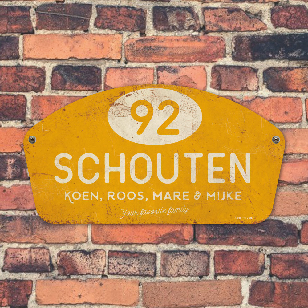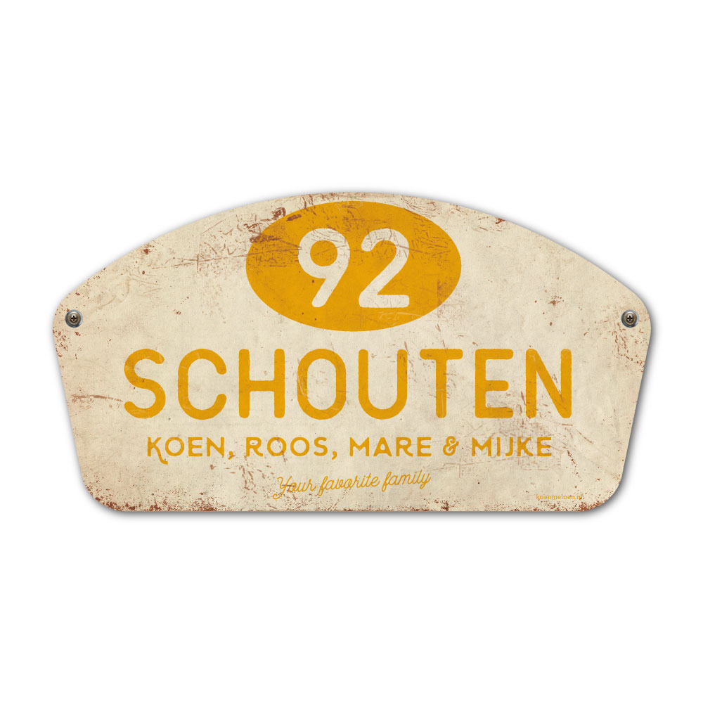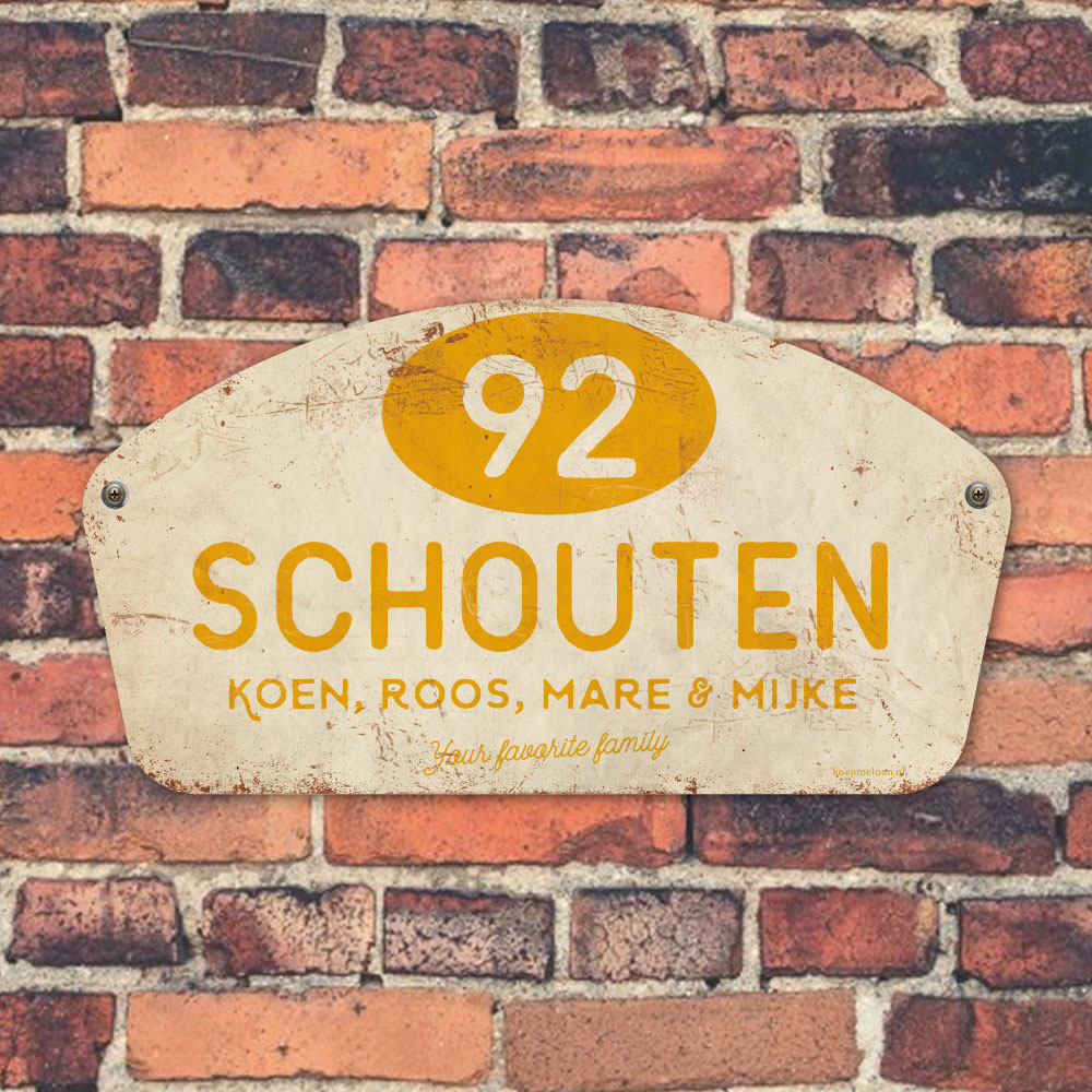 Mooi geel en wit “vintage” naambordje met jouw achternaam, voornamen en huisnummer . Geïnspireerd door oude rallyborden. Stoer en origineel naambordje voor bij de voordeur van jouw huis. Maar natuurlijk ook leuk en origineel als cadeau voor iemand die net verhuisd is (housewarming), voor de (nieuwe) mancave, tuinhuis, paardenstal, hondenhok etc.