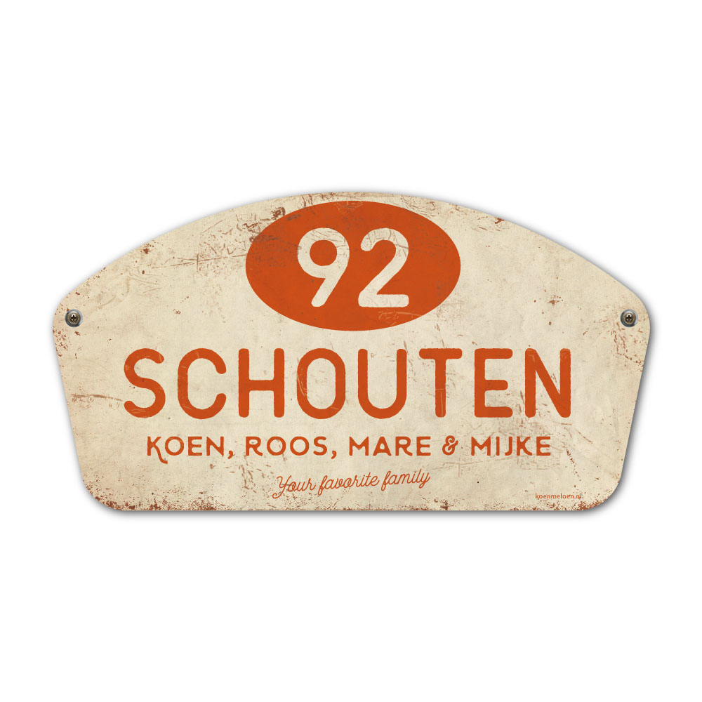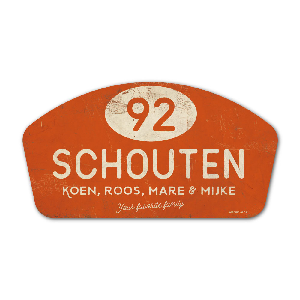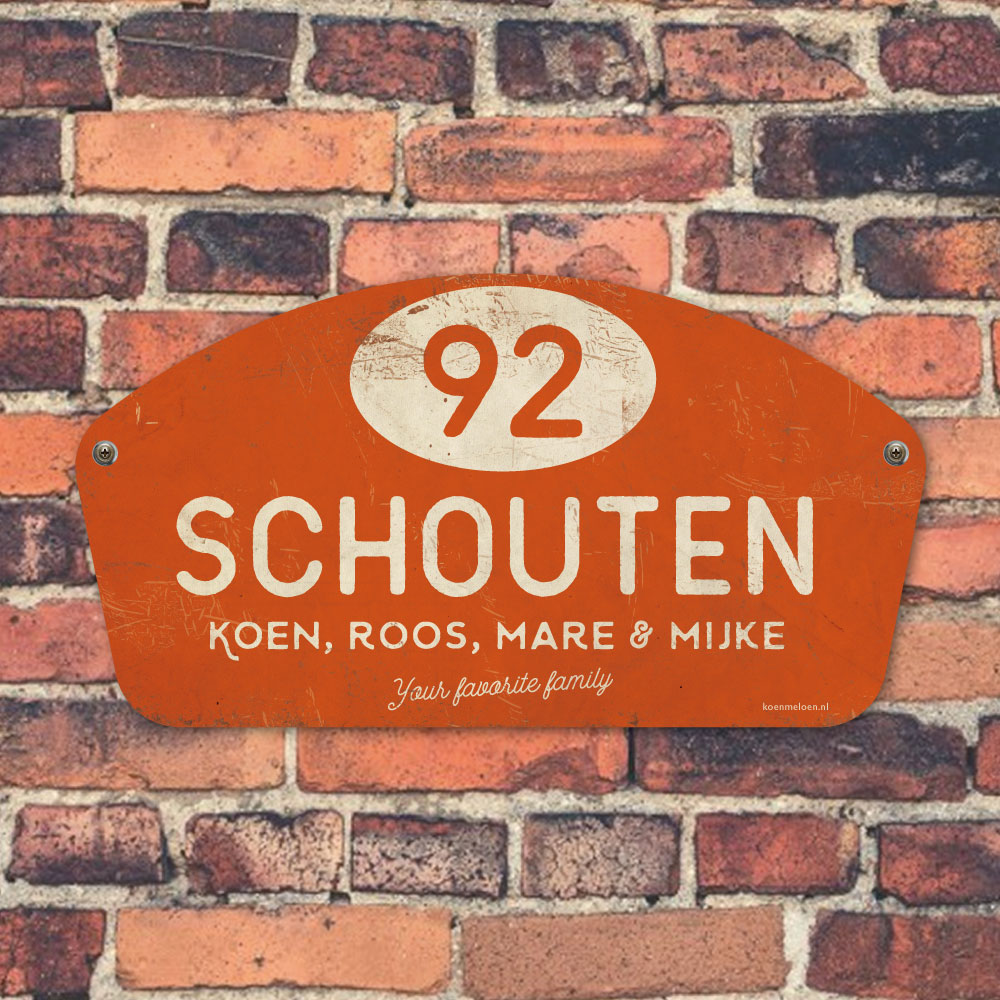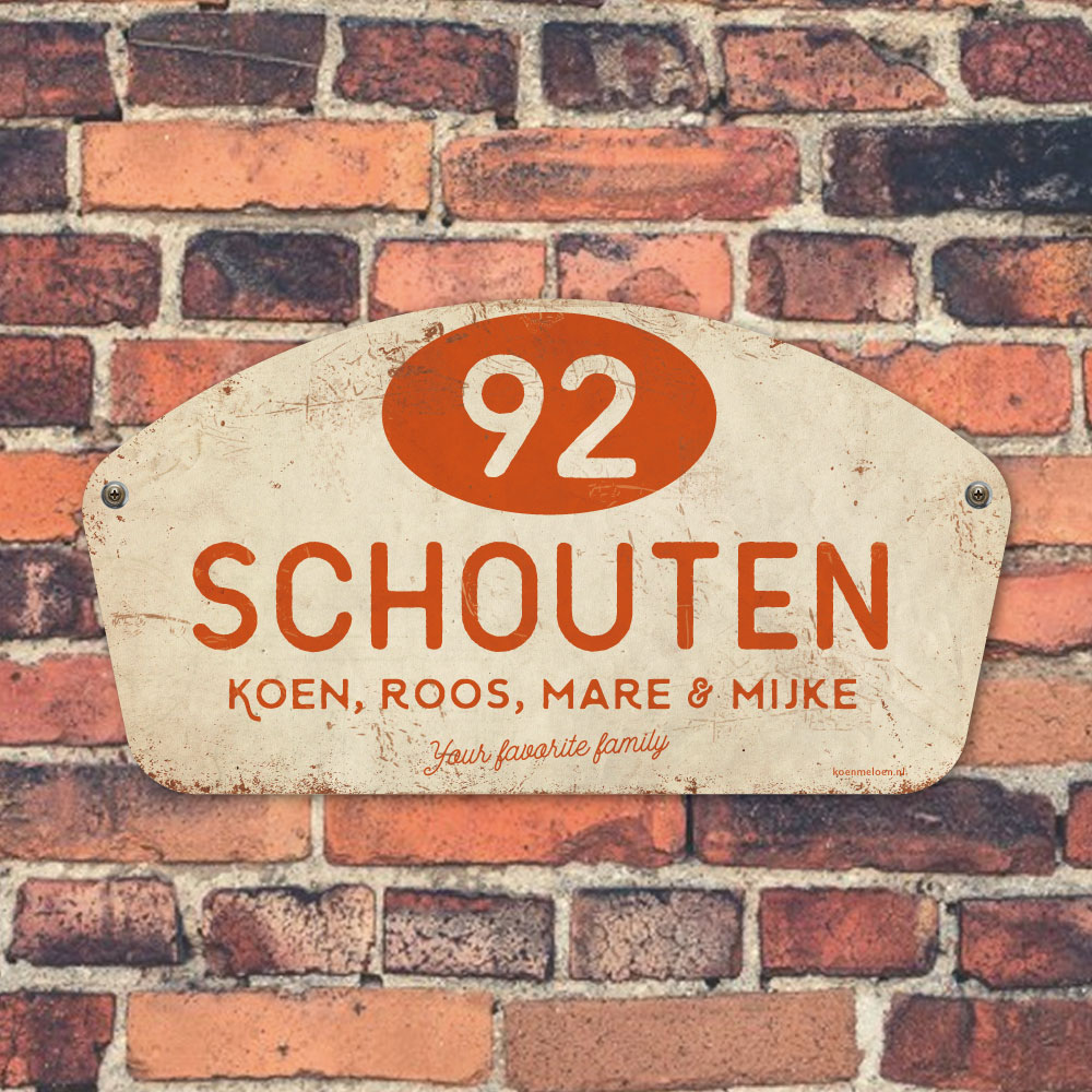 Mooi oranje en wit “vintage” naambordje met jouw achternaam, voornamen en huisnummer . Geïnspireerd door oude rallyborden. Stoer en origineel naambordje voor bij de voordeur van jouw huis. Maar natuurlijk ook leuk en origineel als cadeau voor iemand die net verhuisd is (housewarming), voor de (nieuwe) mancave, tuinhuis, paardenstal, hondenhok etc.