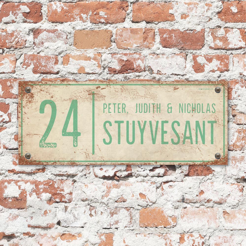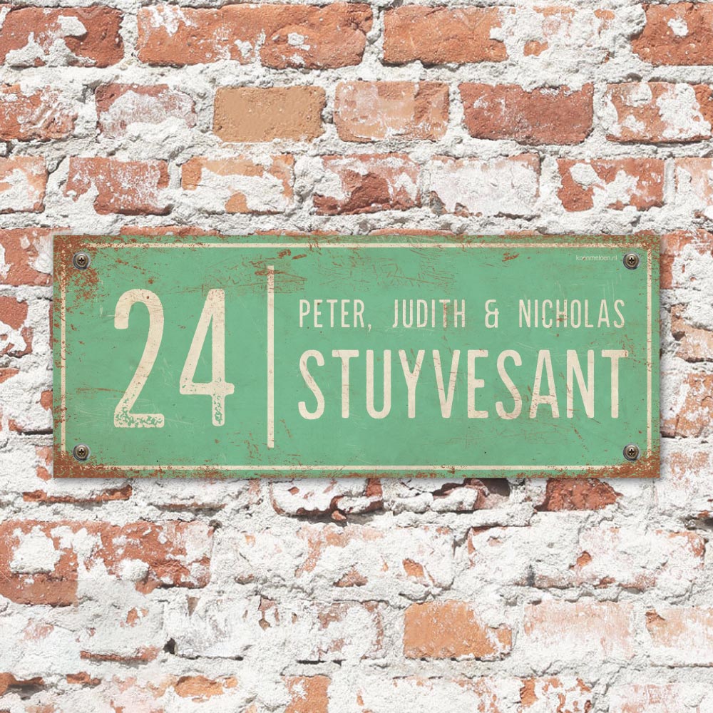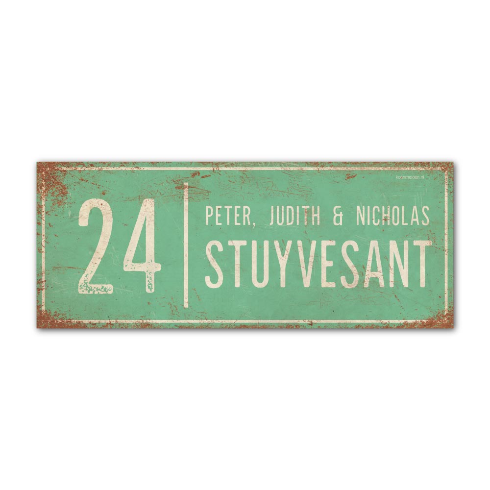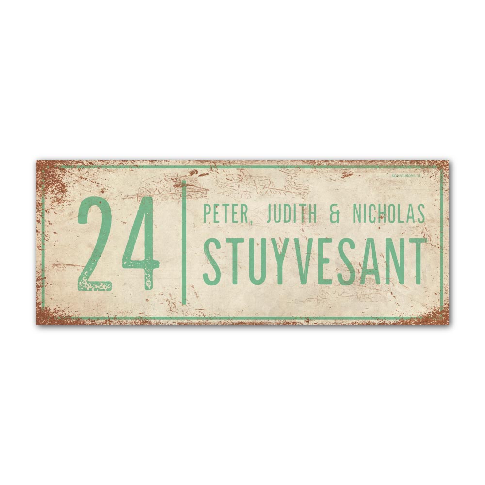 Mooi mint en wit “vintage” rechthoekig naambordje met jouw achternaam, voornamen en huisnummer. Geïnspireerd door oude straatbordjes uit New York. Uniek en origineel naambordje voor bij de voordeur van jouw huis. Maar natuurlijk ook leuk en origineel als cadeau voor iemand die net verhuisd is (housewarming).