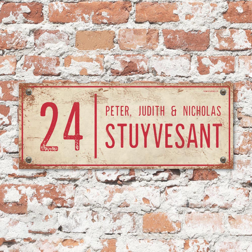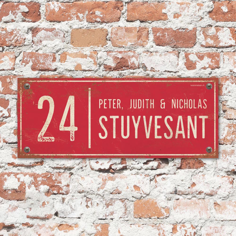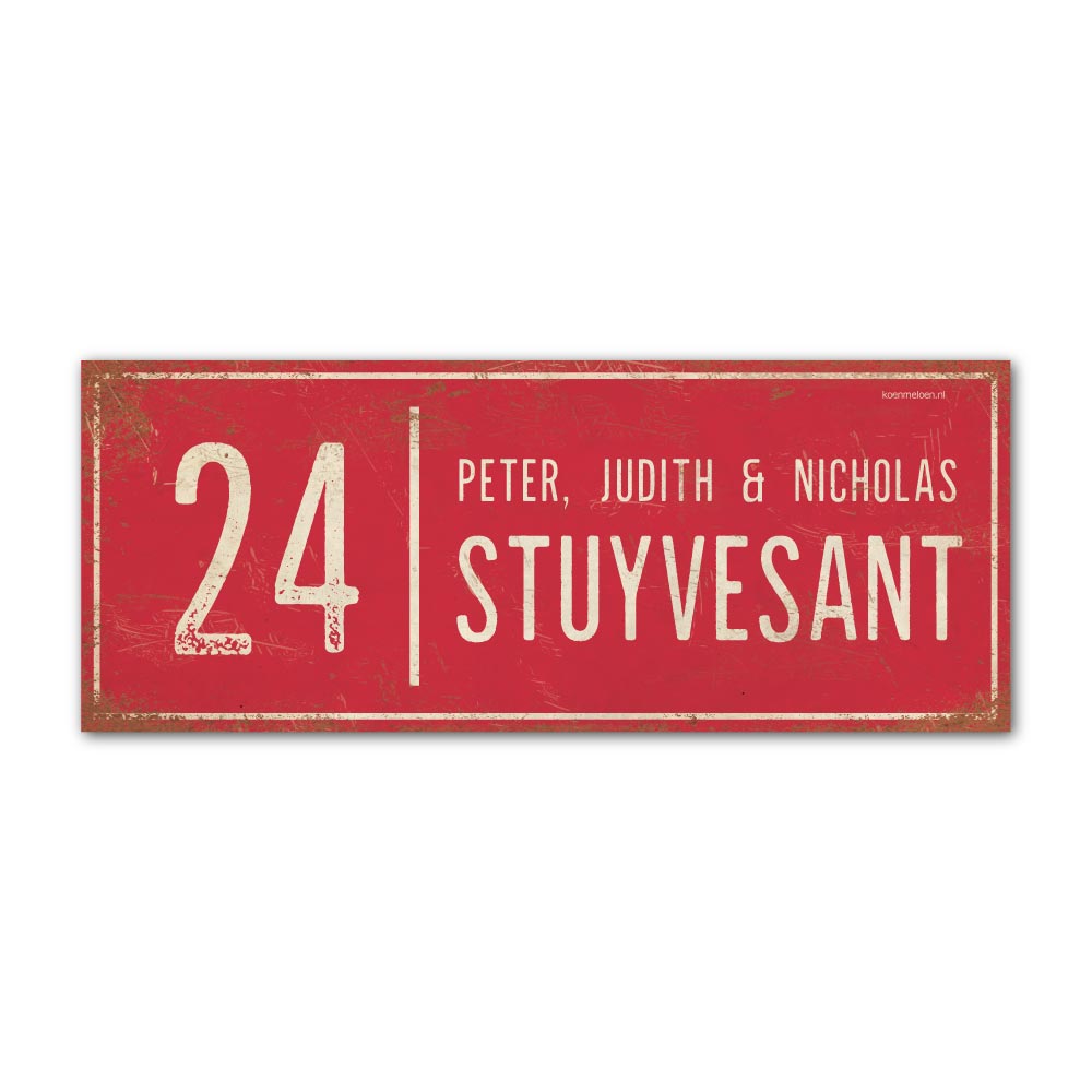 Mooi rood en wit “vintage” rechthoekig naambordje met jouw achternaam, voornamen en huisnummer.Geïnspireerd door oude straatbordjes uit New York. Uniek en origineel naambordje voor bij de voordeur van jouw huis. Maar natuurlijk ook leuk en origineel als cadeau voor iemand die net verhuisd is (housewarming).