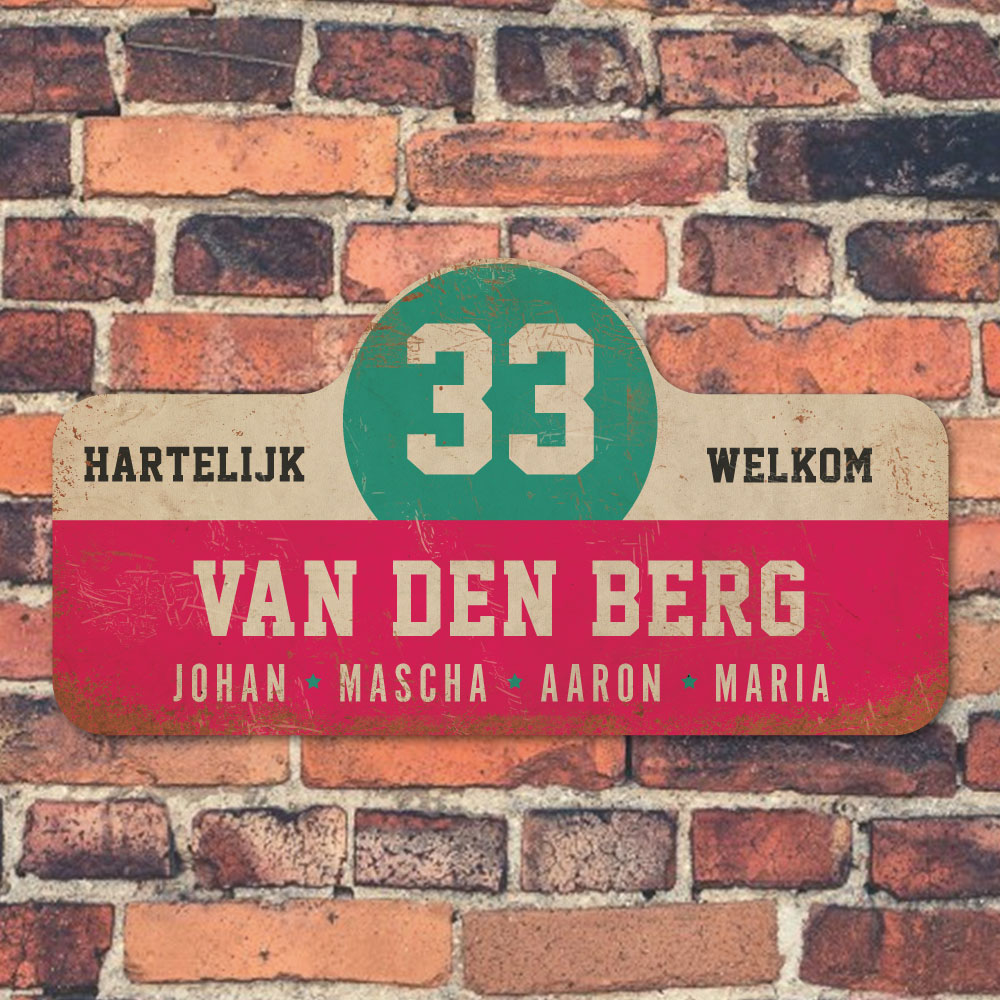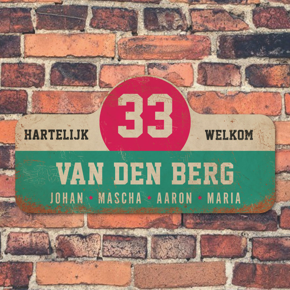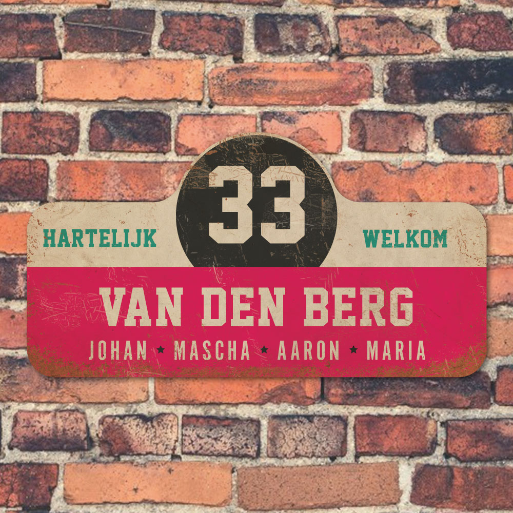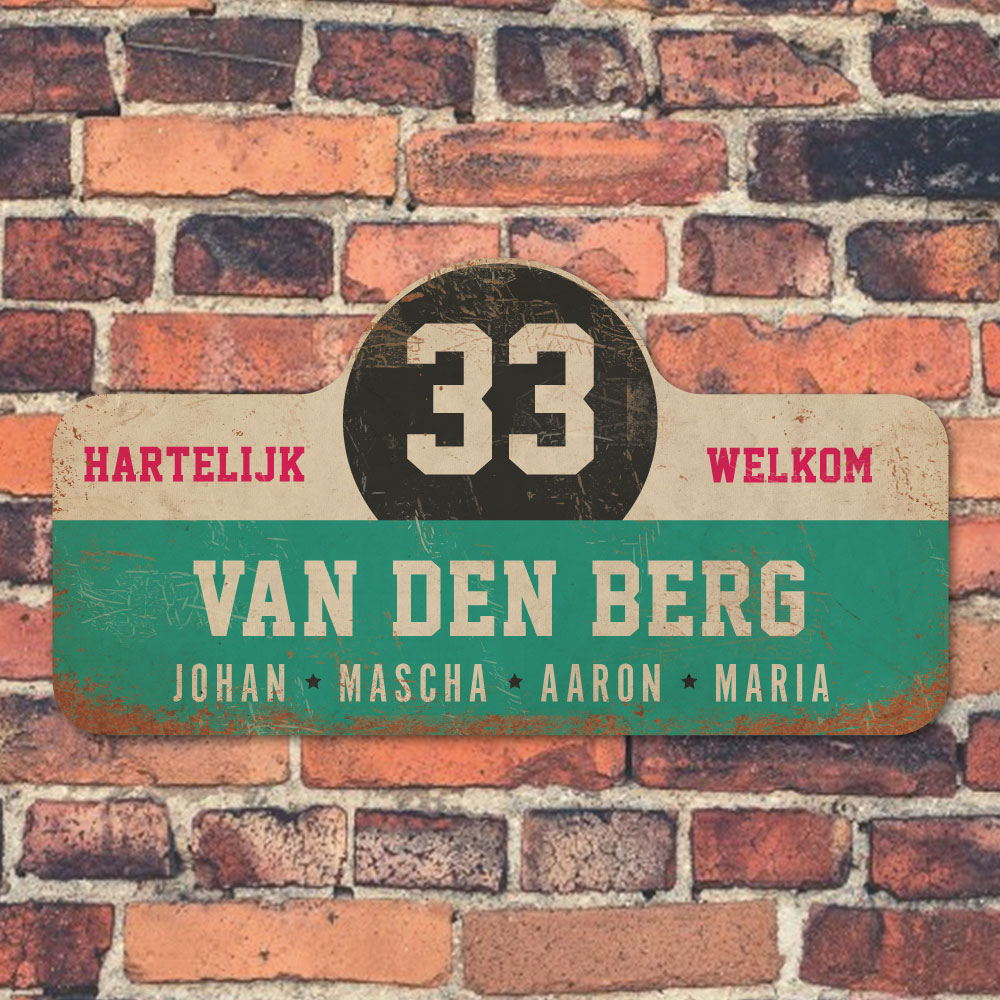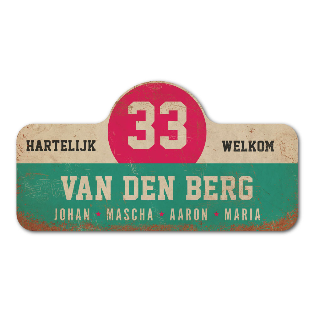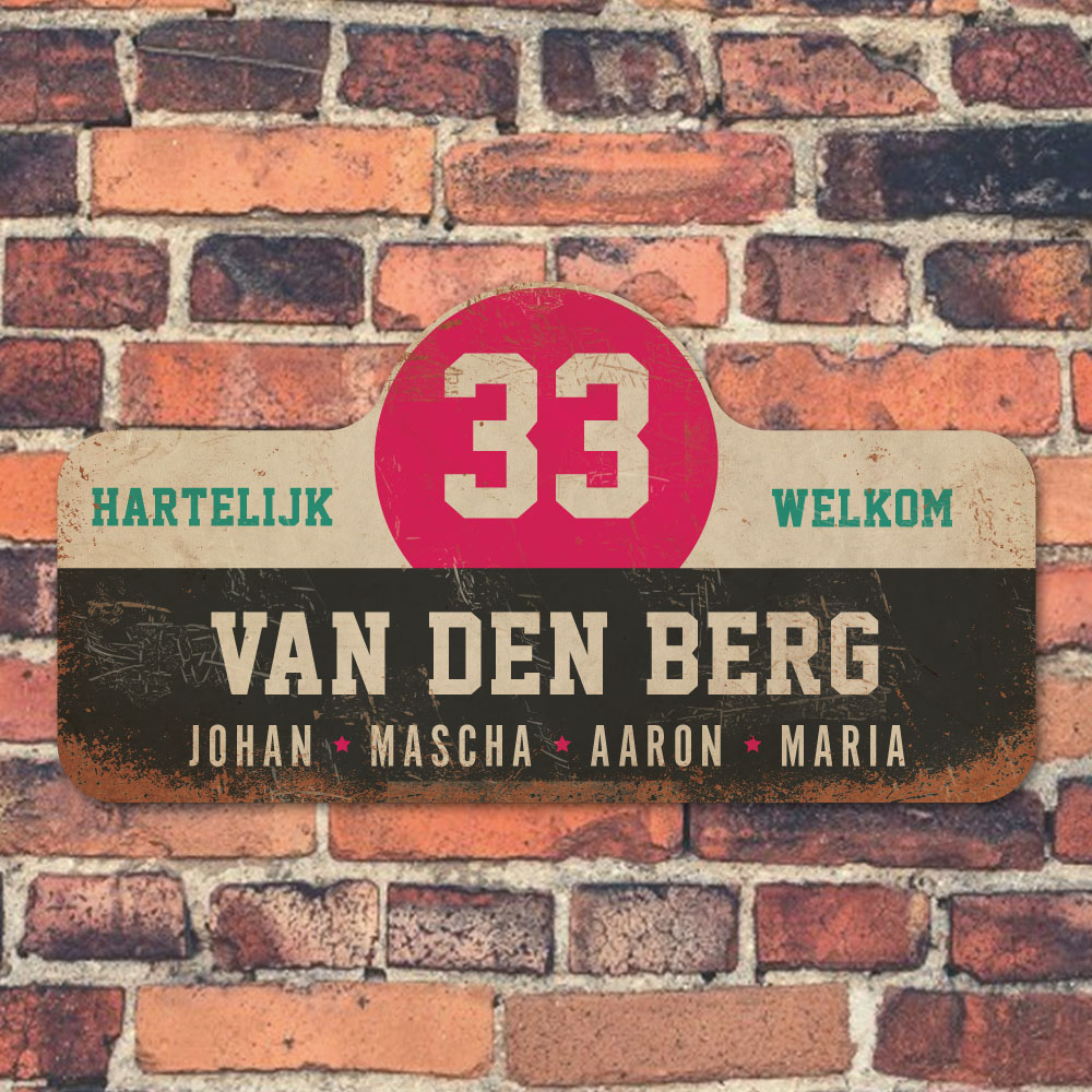 Tof voordeur naambordje in de stijl van oude rallyborden.