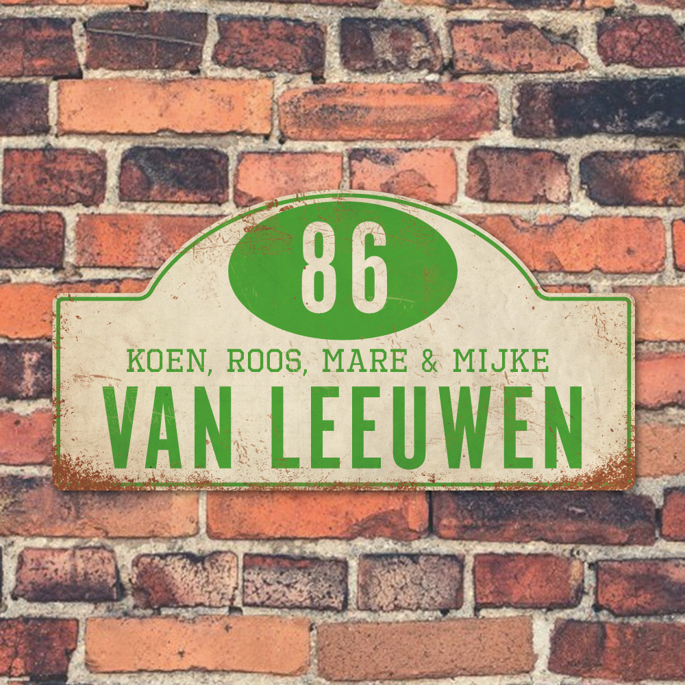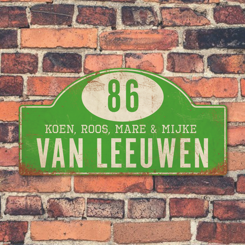 Mooi groen en wit “vintage” naambordje in de vorm van een retro rallybord met uw achternaam, voornamen en huisnummer. Origineel, stoer en mooi bij de voordeur van jouw huis. Maar natuurlijk ook een leuk en verjaardagscadeau of cadeau voor iemand die net verhuisd is (housewarming).