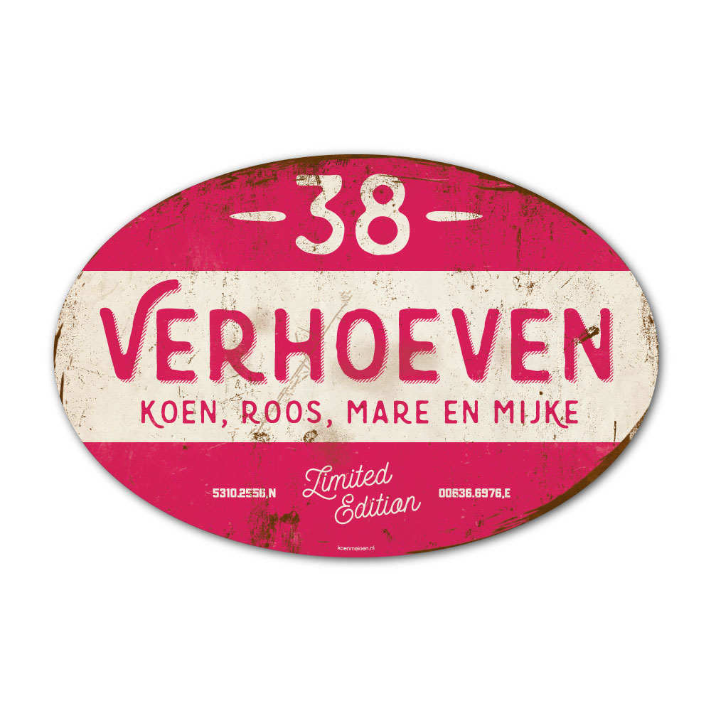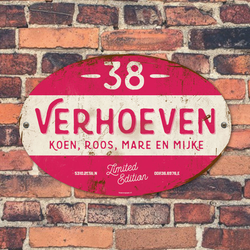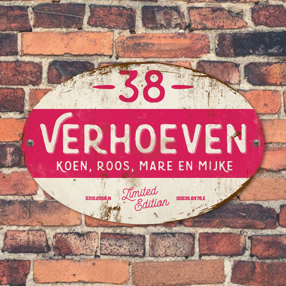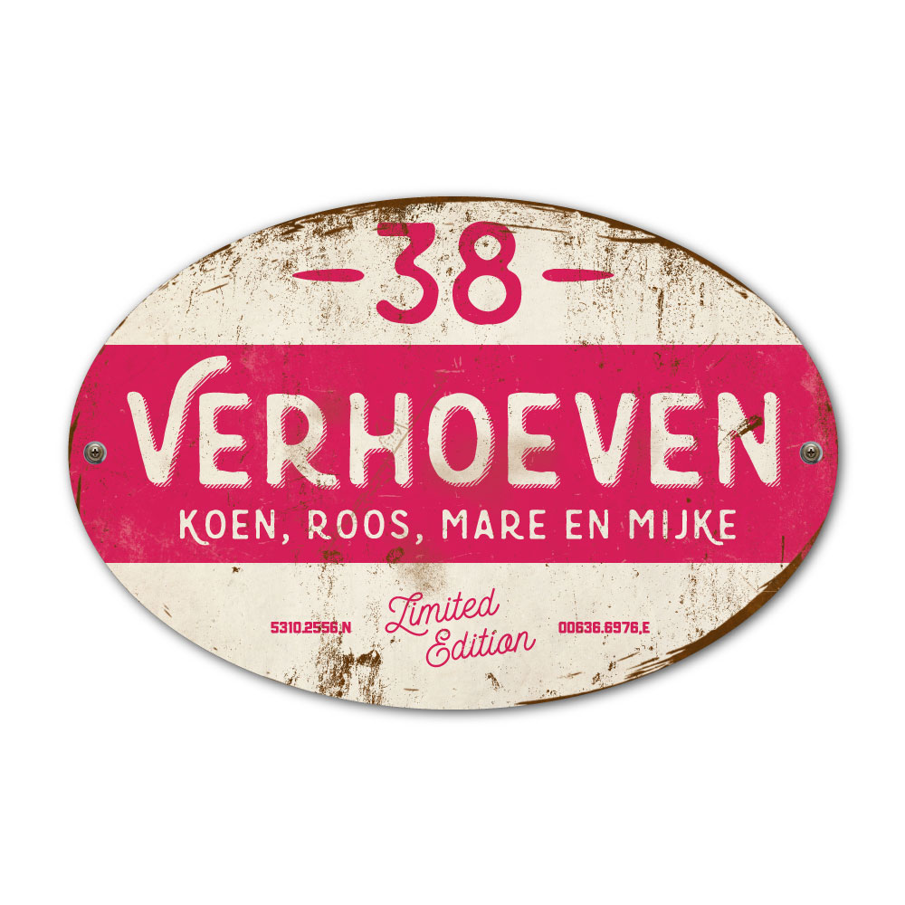 Mooi knalroze en wit “vintage” ovaal naambordje met jouw achternaam, voornamen, gps-coördinaten en huisnummer. Geïnspireerd door oude borden. Stoer en origineel naambordje voor bij de voordeur van jouw huis. Maar natuurlijk ook leuk en origineel als cadeau voor iemand die net verhuisd is (housewarming), voor de (nieuwe) mancave.