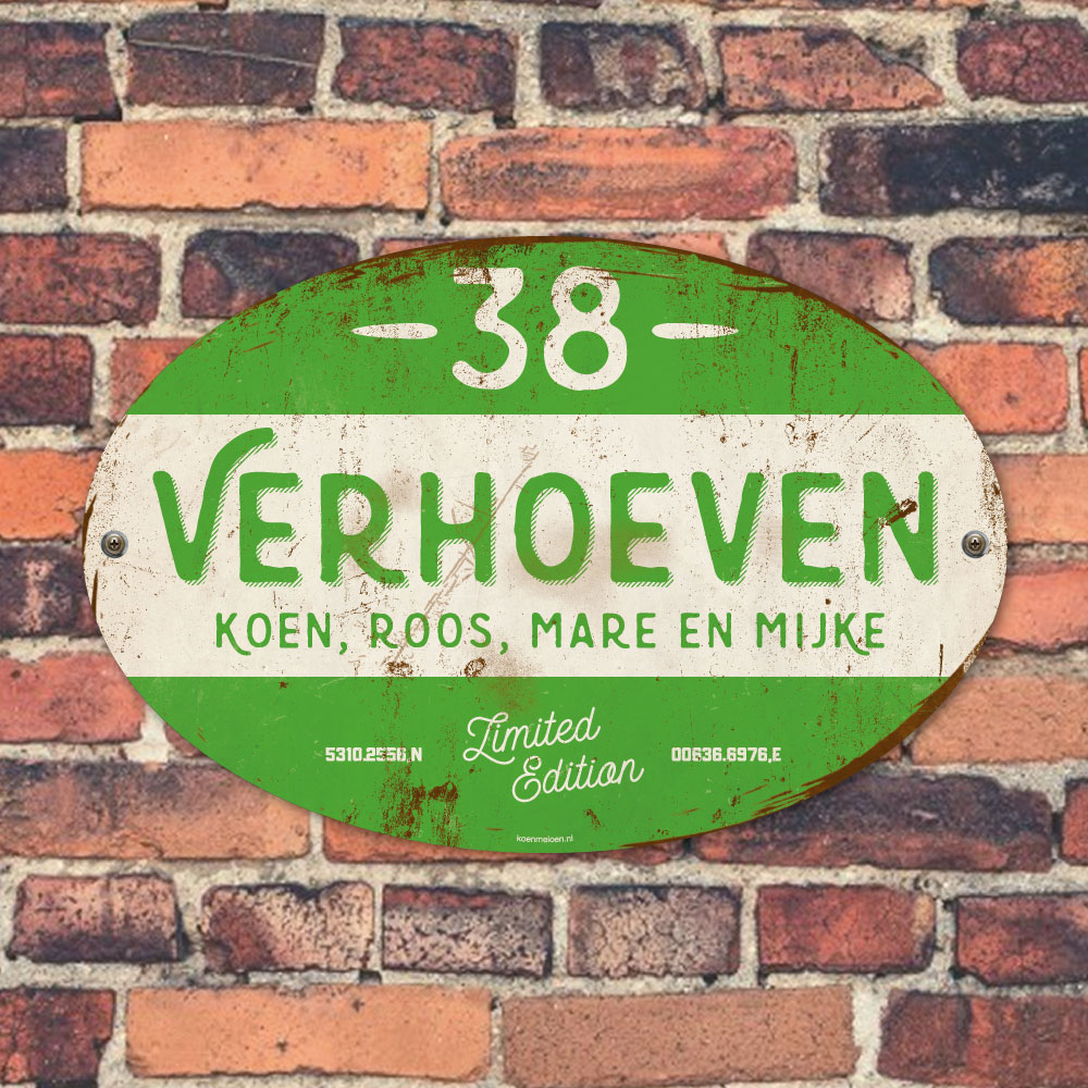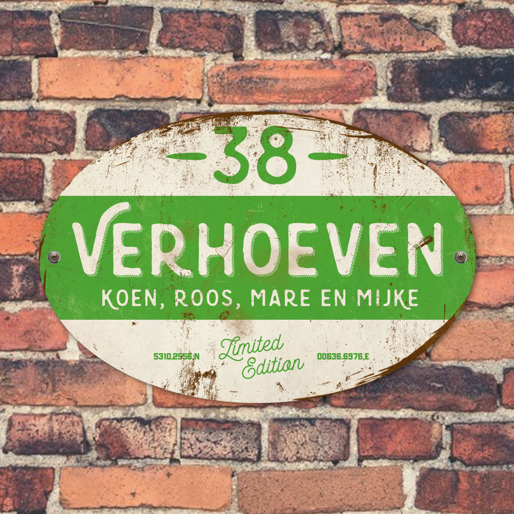 Mooi groen en wit “vintage” ovaal naambordje met jouw achternaam, voornamen, gps-coördinaten en huisnummer. Geïnspireerd door oude borden. Stoer en origineel naambordje voor bij de voordeur van jouw huis. Maar natuurlijk ook leuk en origineel als cadeau voor iemand die net verhuisd is (housewarming), voor de (nieuwe) mancave.