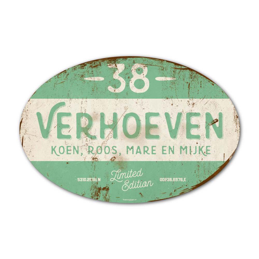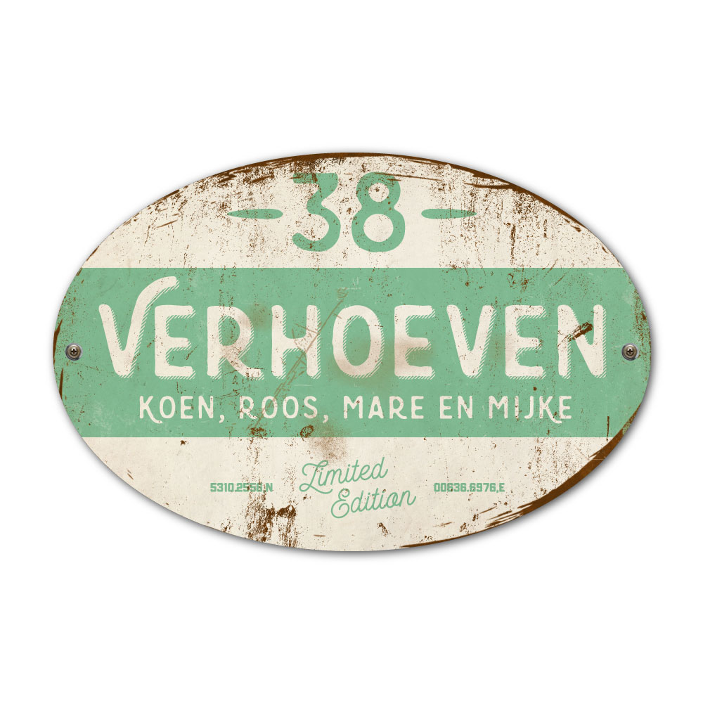Mooi mint en wit “vintage” ovaal naambordje met jouw achternaam, voornamen, gps-coördinaten en huisnummer. Geïnspireerd door oude borden. Stoer en origineel naambordje voor bij de voordeur van jouw huis. Maar natuurlijk ook leuk en origineel als cadeau voor iemand die net verhuisd is (housewarming), voor de (nieuwe) mancave.