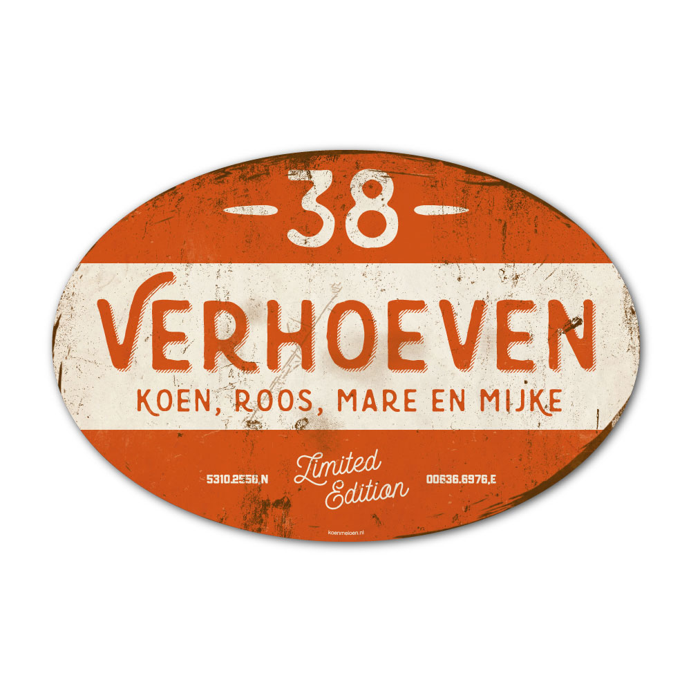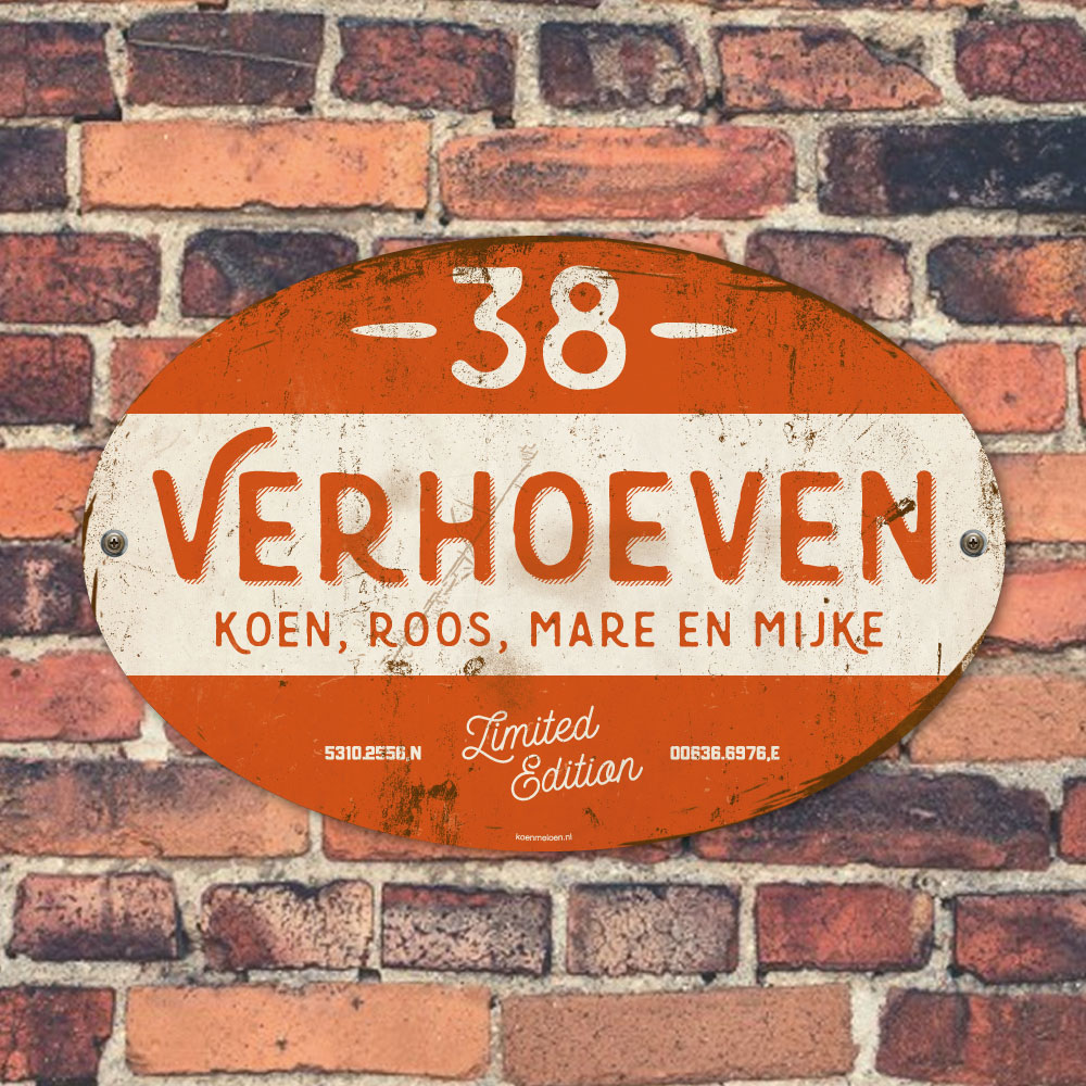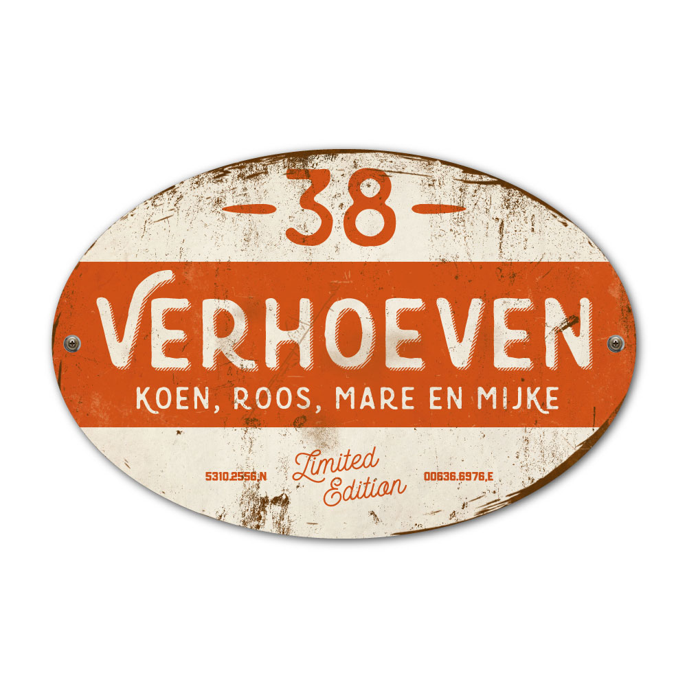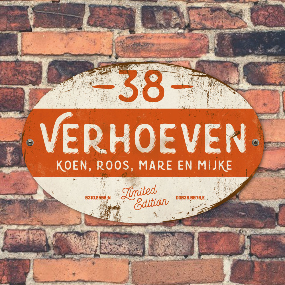 Mooi oranje en wit “vintage” ovaal naambordje met jouw achternaam, voornamen, gps-coördinaten en huisnummer. Geïnspireerd door oude borden. Stoer en origineel naambordje voor bij de voordeur van jouw huis. Maar natuurlijk ook leuk en origineel als cadeau voor iemand die net verhuisd is (housewarming), voor de (nieuwe) mancave.
