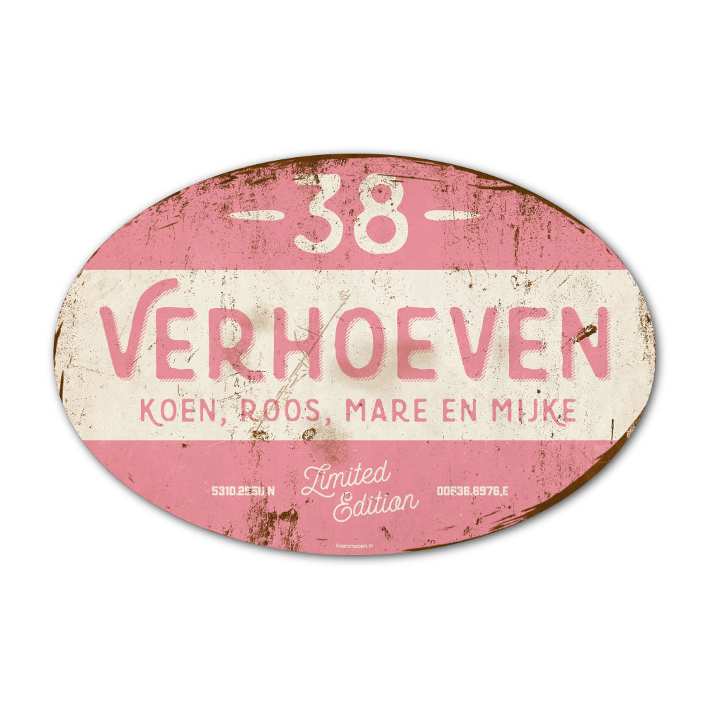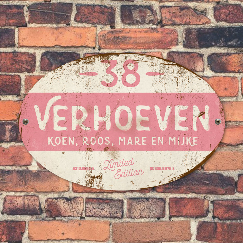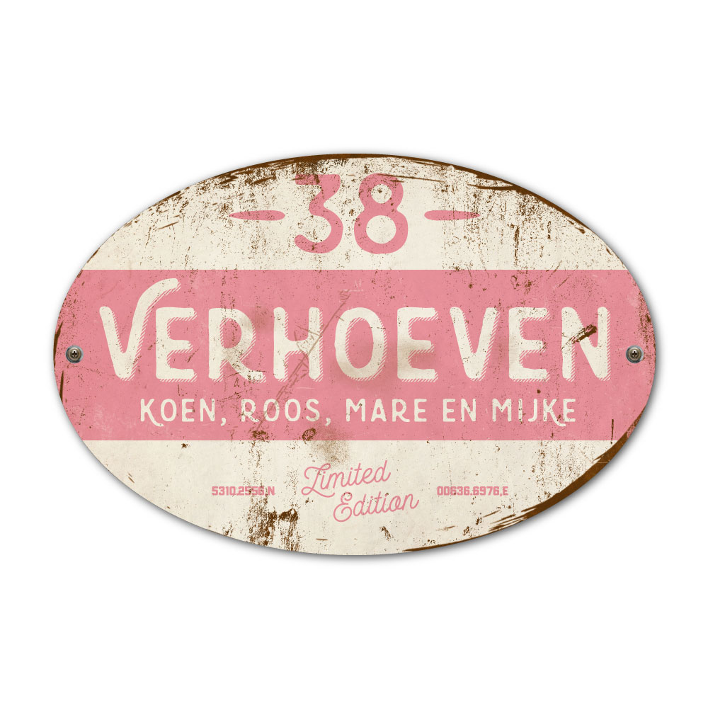 Mooi roze en wit”vintage” ovaal naambordje met jouw achternaam, voornamen, gps-coördinaten en huisnummer. Geïnspireerd door oude borden. Stoer en origineel naambordje voor bij de voordeur van jouw huis. Maar natuurlijk ook leuk en origineel als cadeau voor iemand die net verhuisd is (housewarming), voor de (nieuwe) mancave.