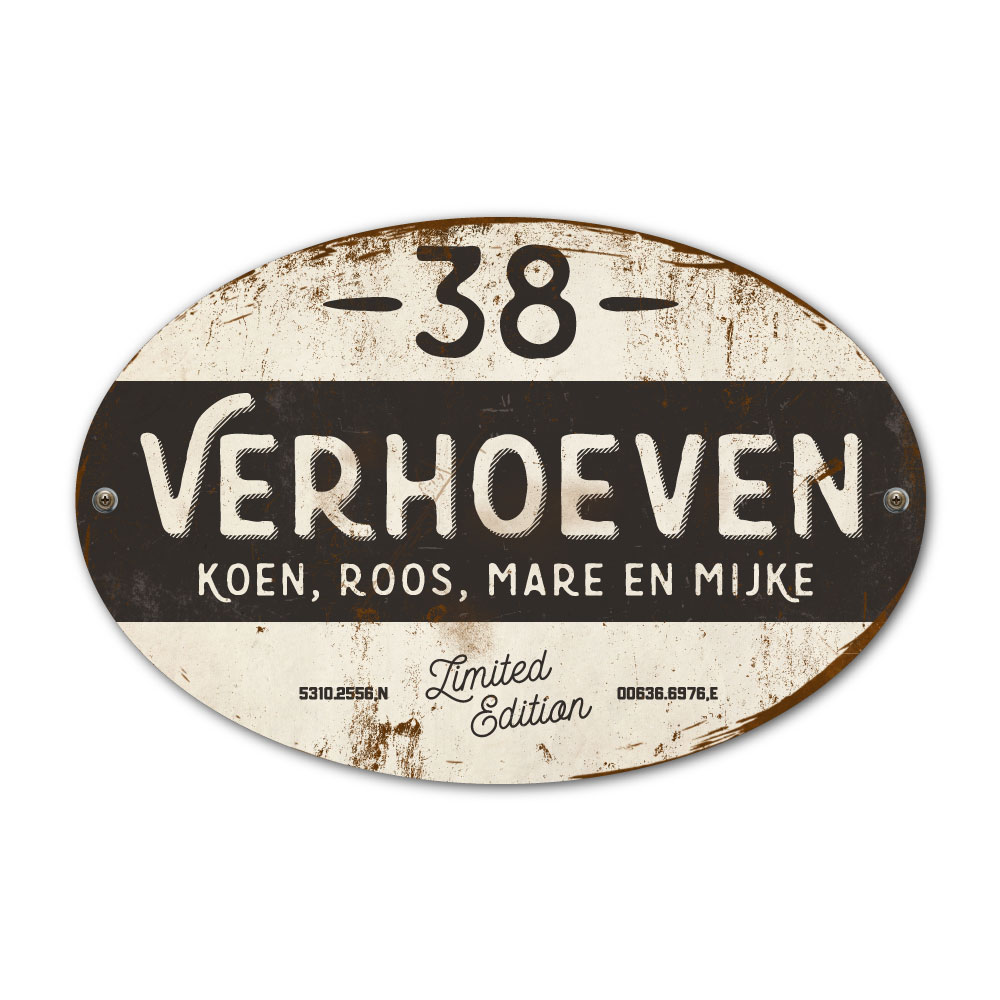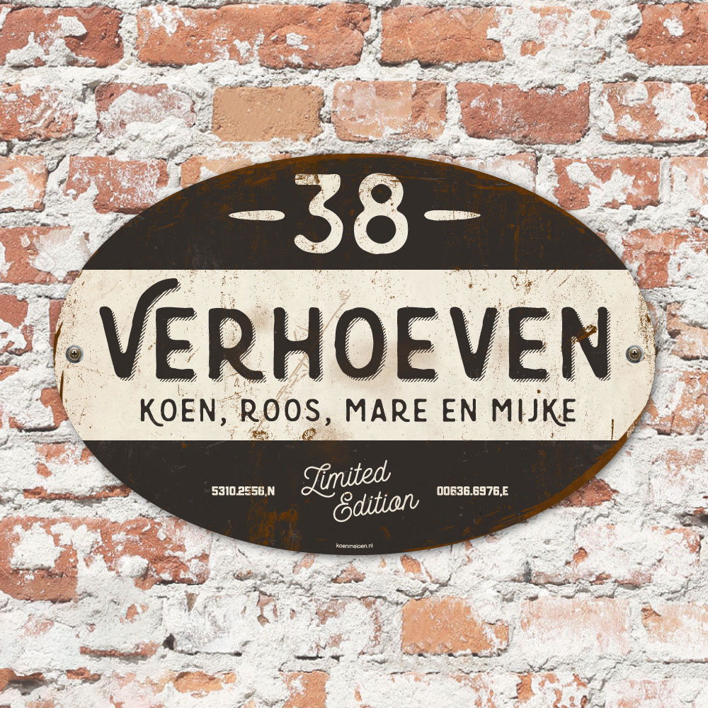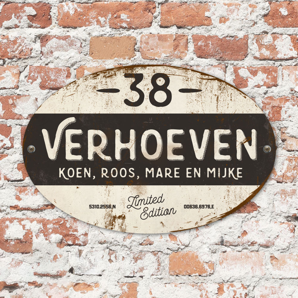 Mooi zwart en wit “vintage” ovaal naambordje met jouw achternaam, voornamen, gps-coördinaten en huisnummer. Geïnspireerd door oude borden. Stoer en origineel naambordje voor bij de voordeur van jouw huis. Maar natuurlijk ook leuk en origineel als cadeau voor iemand die net verhuisd is (housewarming), voor de (nieuwe) mancave.