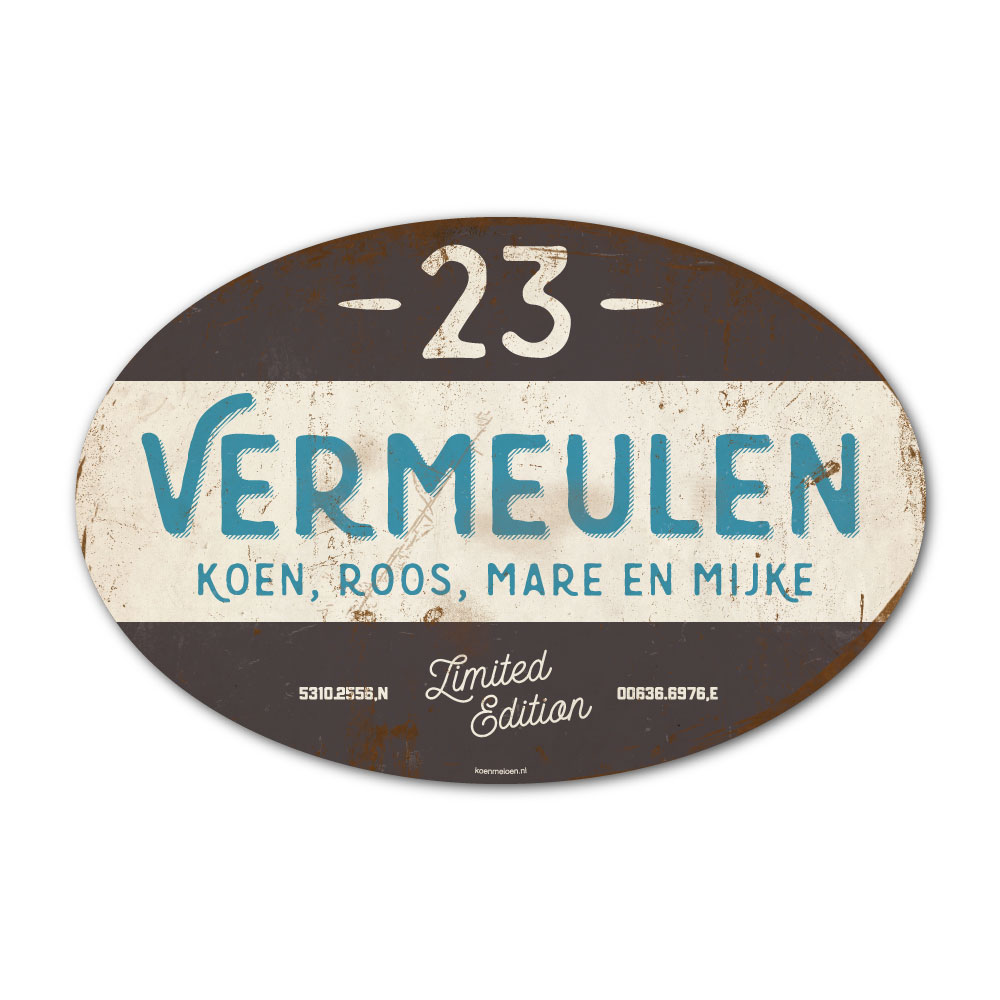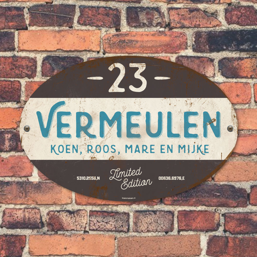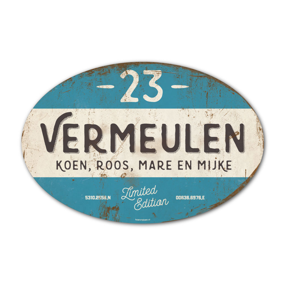 Mooi blauw, zwart en wit “vintage” ovaal naambordje met jouw achternaam, voornamen, coördinaten en huisnummer. Geïnspireerd door oude borden. Stoer en origineel naambordje voor bij de voordeur van jouw huis. Maar natuurlijk ook leuk en origineel als cadeau voor iemand die net verhuisd is (housewarming), voor de (nieuwe) mancave.