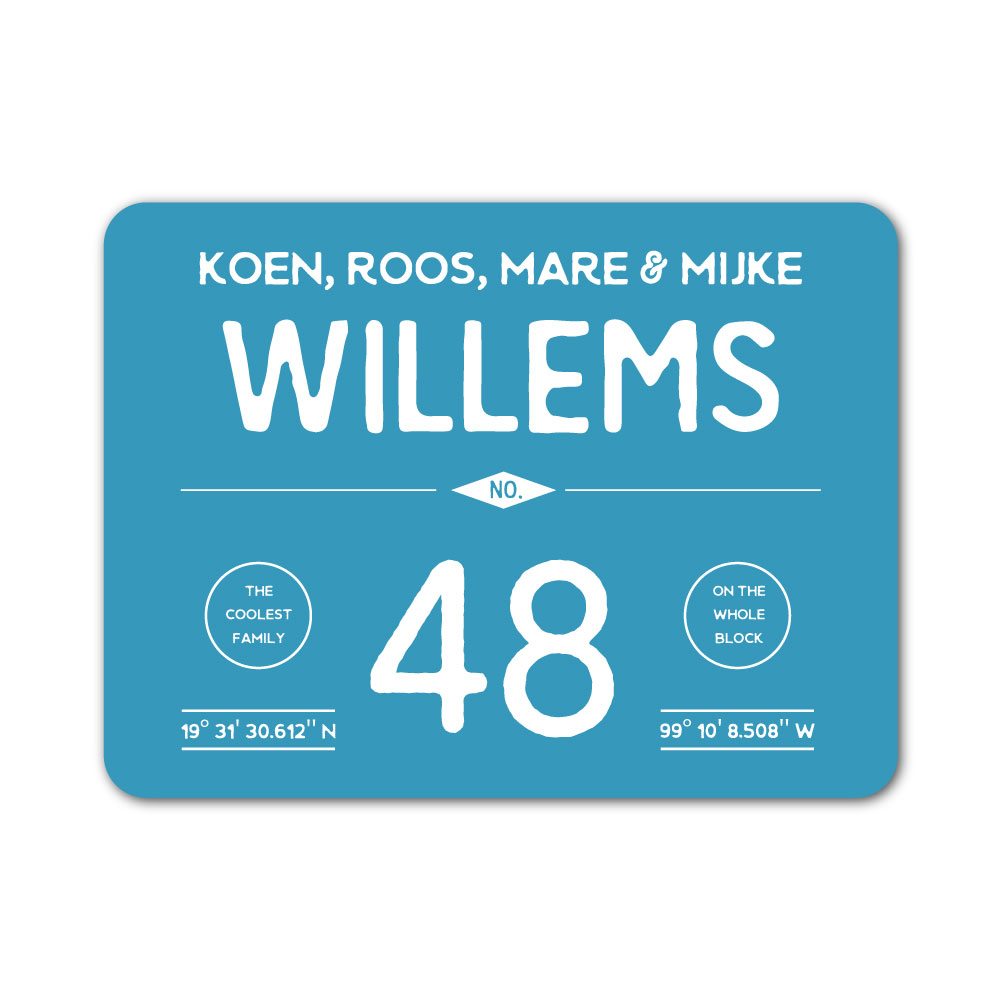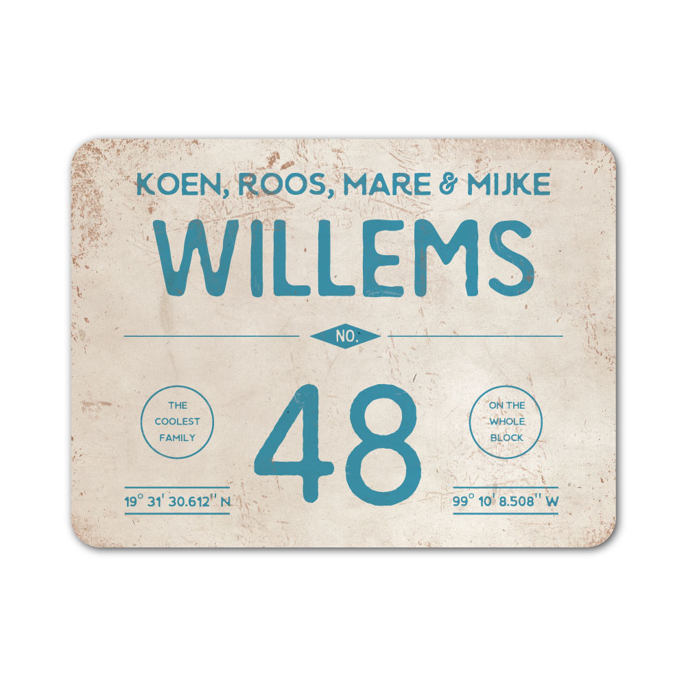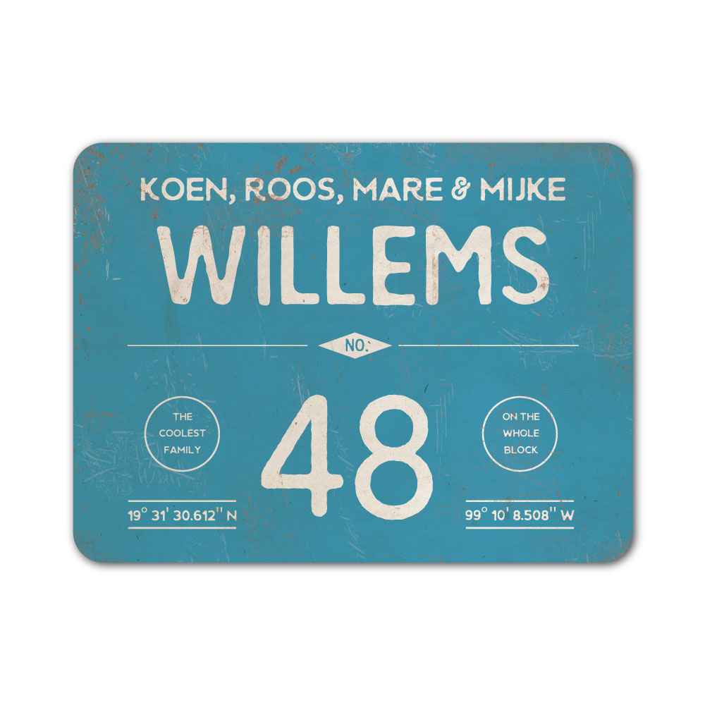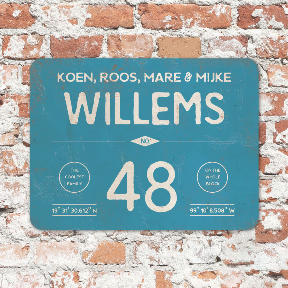 Stoer blauw en wit “vintage” naambordje met jouw achternaam, voornamen, huisnummer en coördinaten en afgeronde hoeken. Origineel naambordje voor bij de voordeur van jouw huis. Maar natuurlijk ook leuk en origineel als cadeau voor iemand die net verhuisd is (housewarming), voor de (nieuwe) mancave, tuinhuis, paardenstal, hondenhok etc.