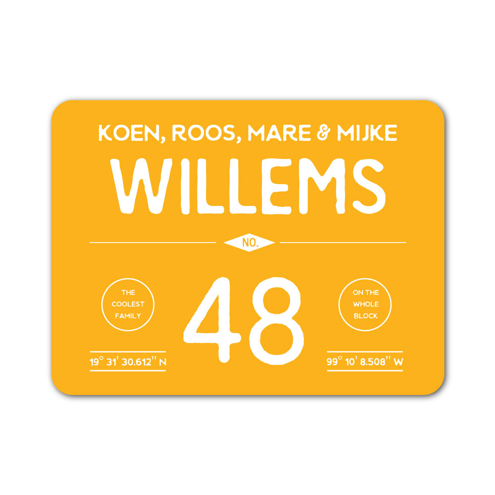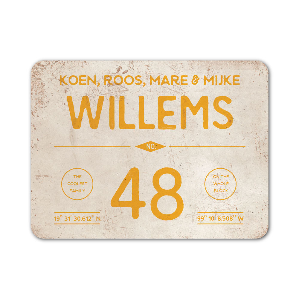 Stoer geel en wit “vintage” naambordje met jouw achternaam, voornamen, huisnummer en coördinaten en afgeronde hoeken. Origineel naambordje voor bij de voordeur van jouw huis. Maar natuurlijk ook leuk en origineel als cadeau voor iemand die net verhuisd is (housewarming), voor de (nieuwe) mancave, tuinhuis, paardenstal, hondenhok etc.