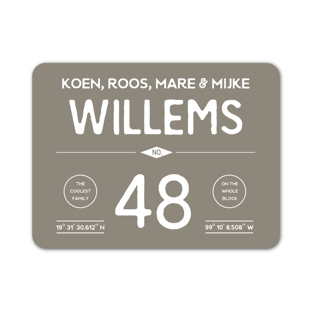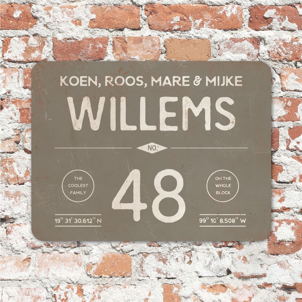 Stoer grijs en wit “vintage” naambordje met jouw achternaam, voornamen, huisnummer en coördinaten en afgeronde hoeken. Origineel naambordje voor bij de voordeur van jouw huis. Maar natuurlijk ook leuk en origineel als cadeau voor iemand die net verhuisd is (housewarming), voor de (nieuwe) mancave, tuinhuis, paardenstal, hondenhok etc.