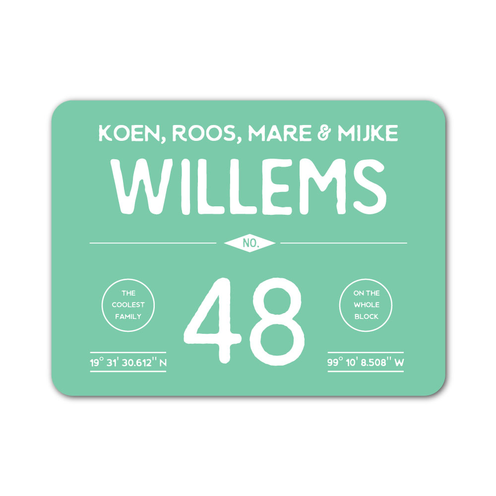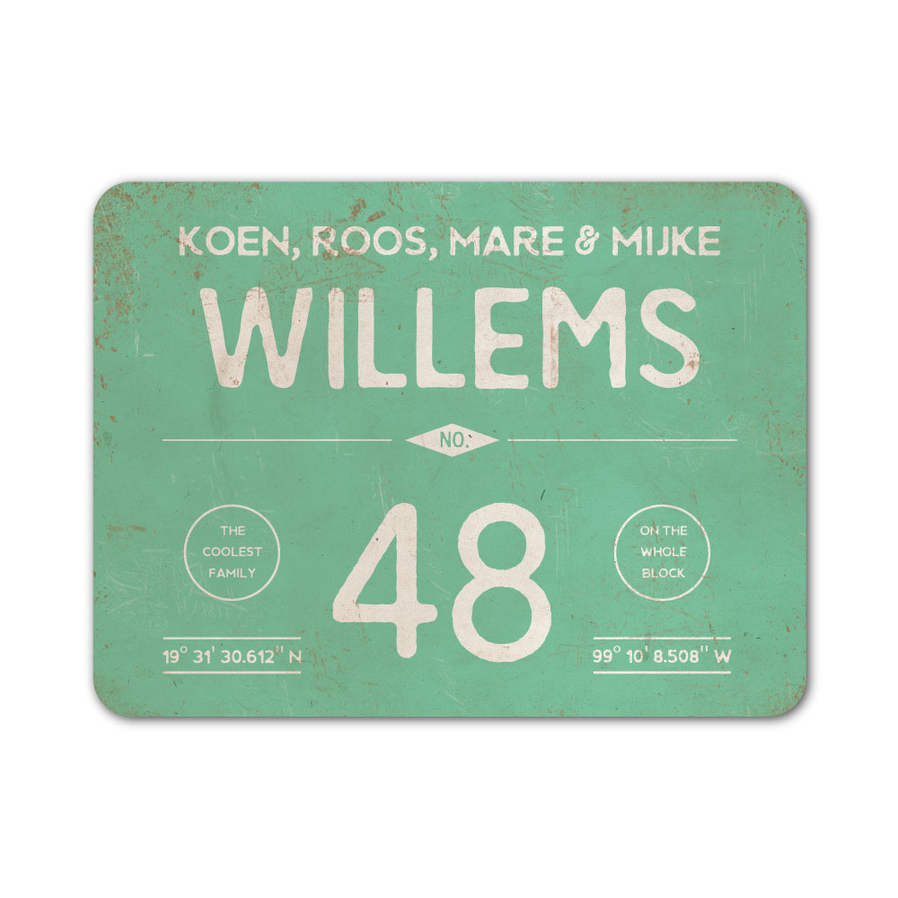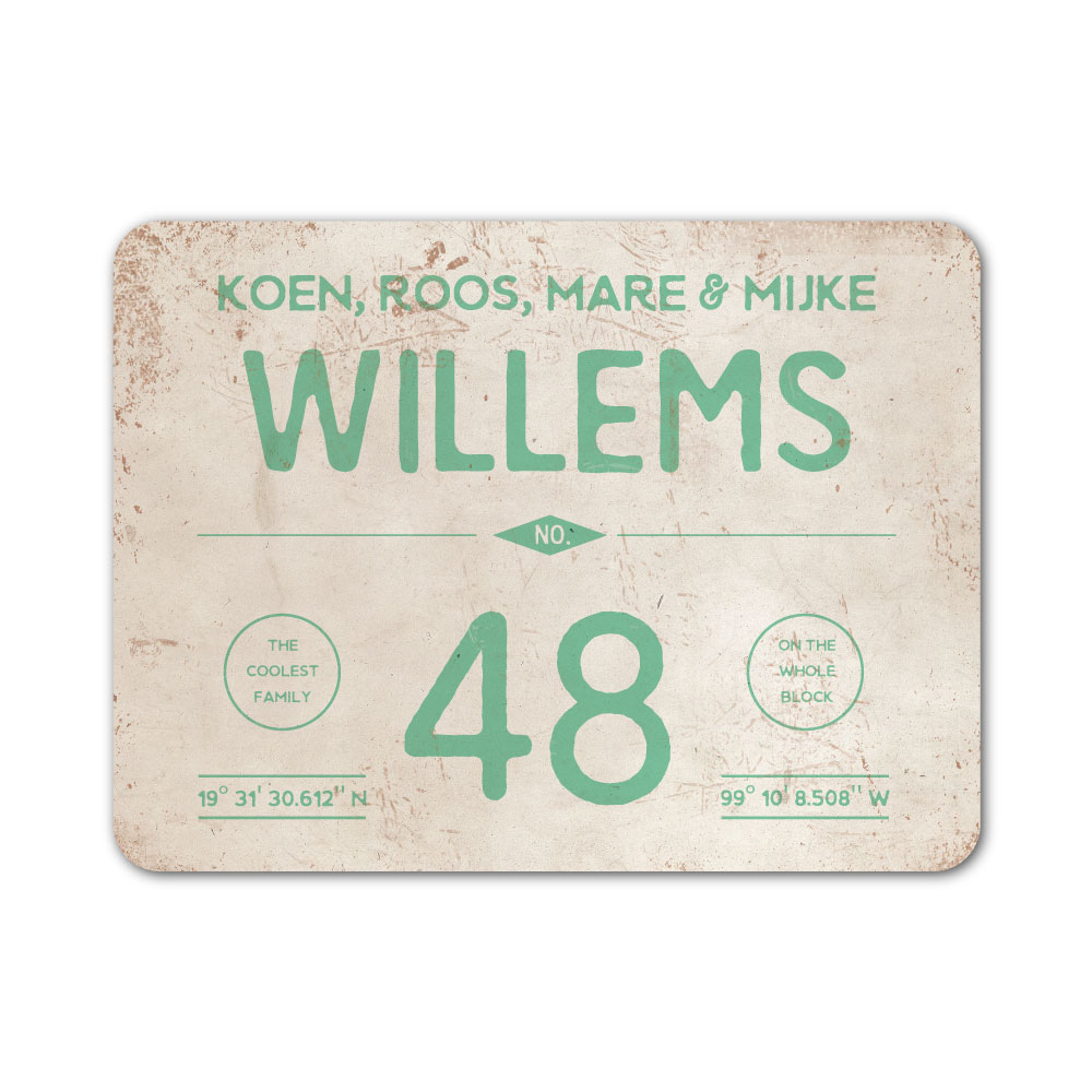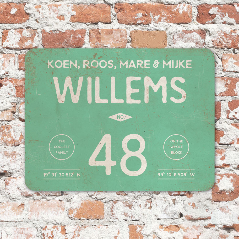 Stoer mint en wit “vintage” naambordje met jouw achternaam, voornamen, huisnummer en coördinaten en afgeronde hoeken. Origineel naambordje voor bij de voordeur van jouw huis. Maar natuurlijk ook leuk en origineel als cadeau voor iemand die net verhuisd is (housewarming), voor de (nieuwe) mancave, tuinhuis, paardenstal, hondenhok etc.