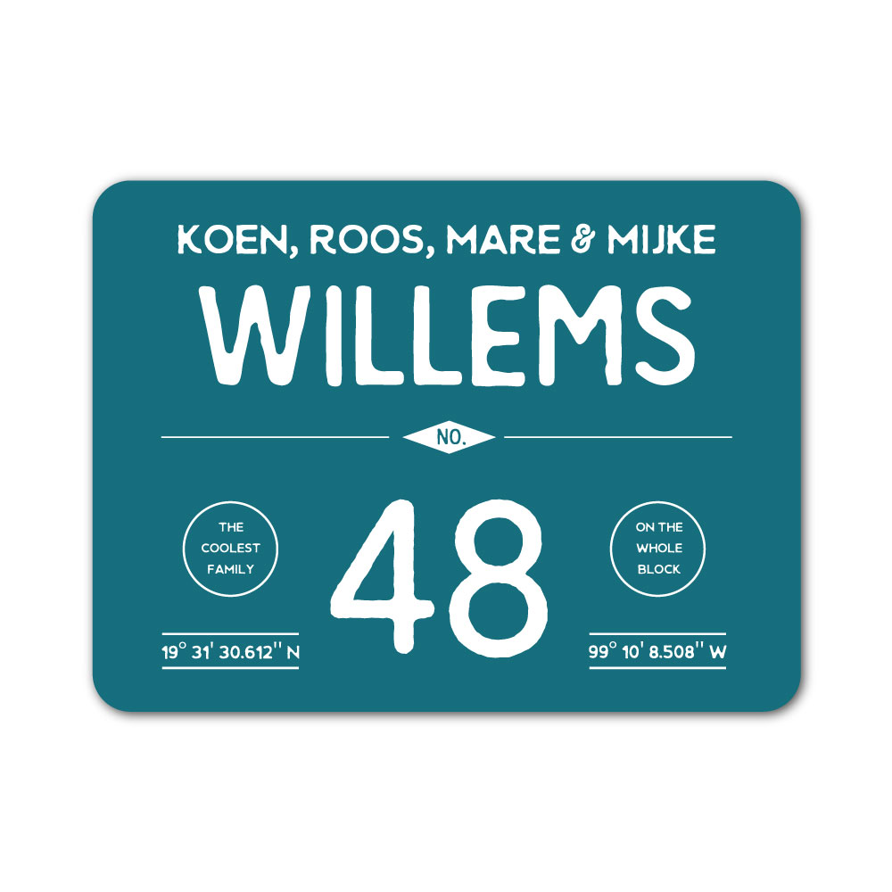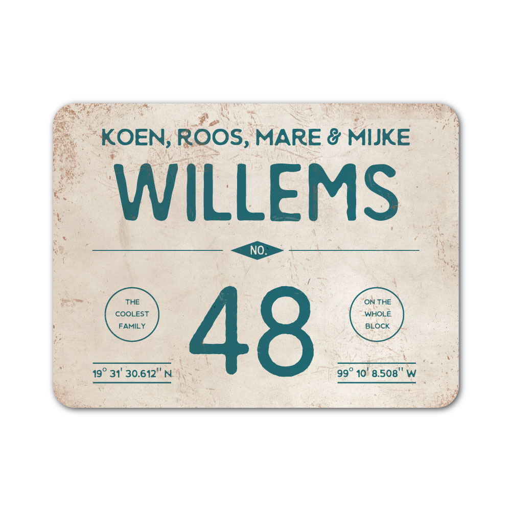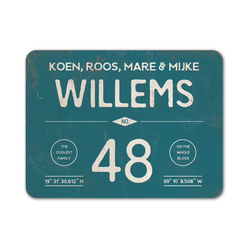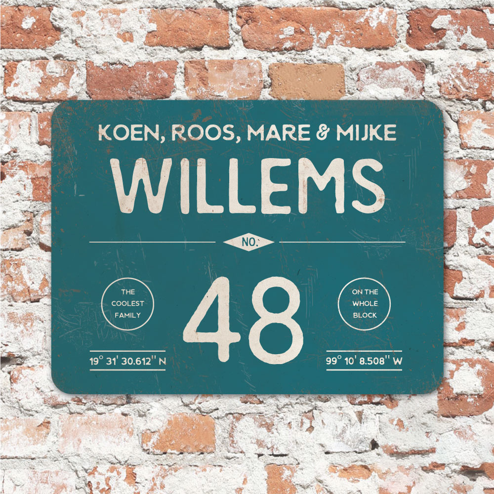 Stoer petrol blauw en wit “vintage” naambordje met jouw achternaam, voornamen, huisnummer en coördinaten en afgeronde hoeken. Origineel naambordje voor bij de voordeur van jouw huis. Maar natuurlijk ook leuk en origineel als cadeau voor iemand die net verhuisd is (housewarming), voor de (nieuwe) mancave, tuinhuis, paardenstal, hondenhok etc.