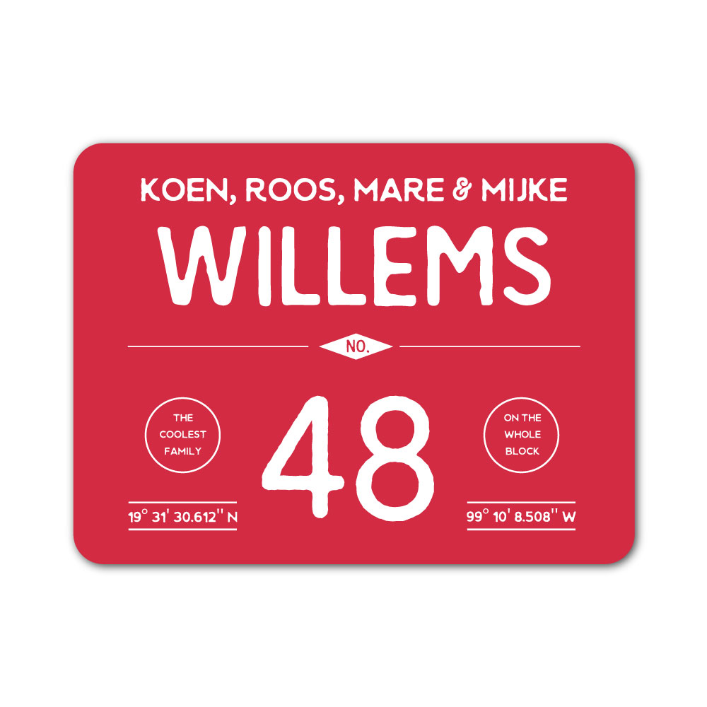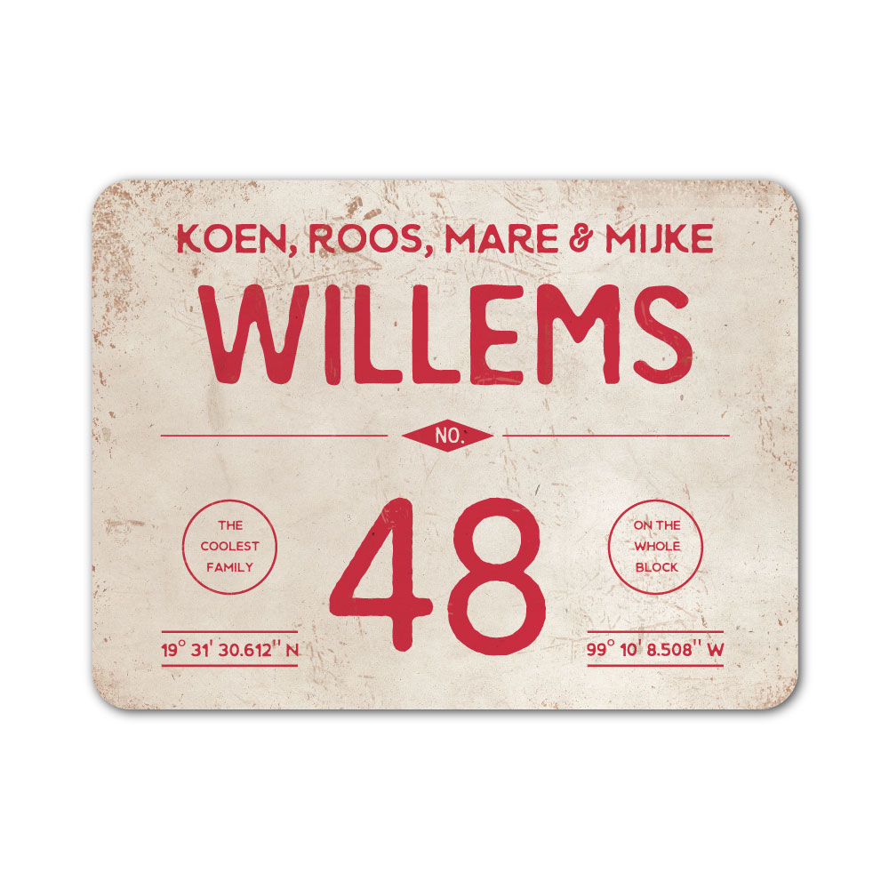 Stoer rood en wit “vintage” naambordje met jouw achternaam, voornamen, huisnummer en coördinaten en afgeronde hoeken. Origineel naambordje voor bij de voordeur van jouw huis. Maar natuurlijk ook leuk en origineel als cadeau voor iemand die net verhuisd is (housewarming), voor de (nieuwe) mancave, tuinhuis, paardenstal, hondenhok etc.
