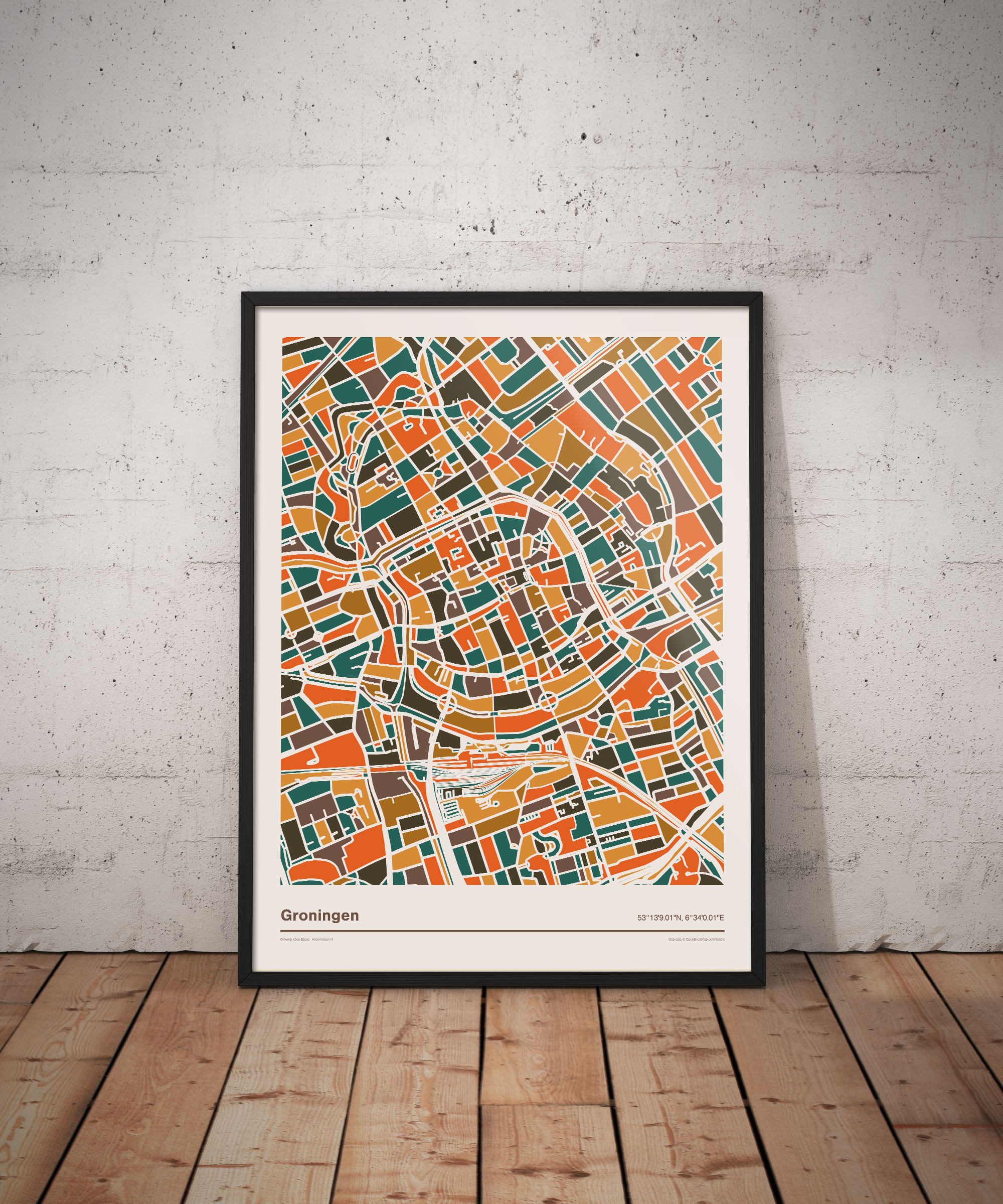 Mozaïek kaart/plattegrond van de stad Groningen in oranje en bruine tinten. De kaart beslaat een deel van de stad. Met name het stadscentrum. Groningen is een oude studentenstad met een jonge bevolking. De jonge bevolking zorgt er voor dat er altijd wel iets te doen is in Groningen en maakt Groningen één van de meest creatieve steden van Nederland.