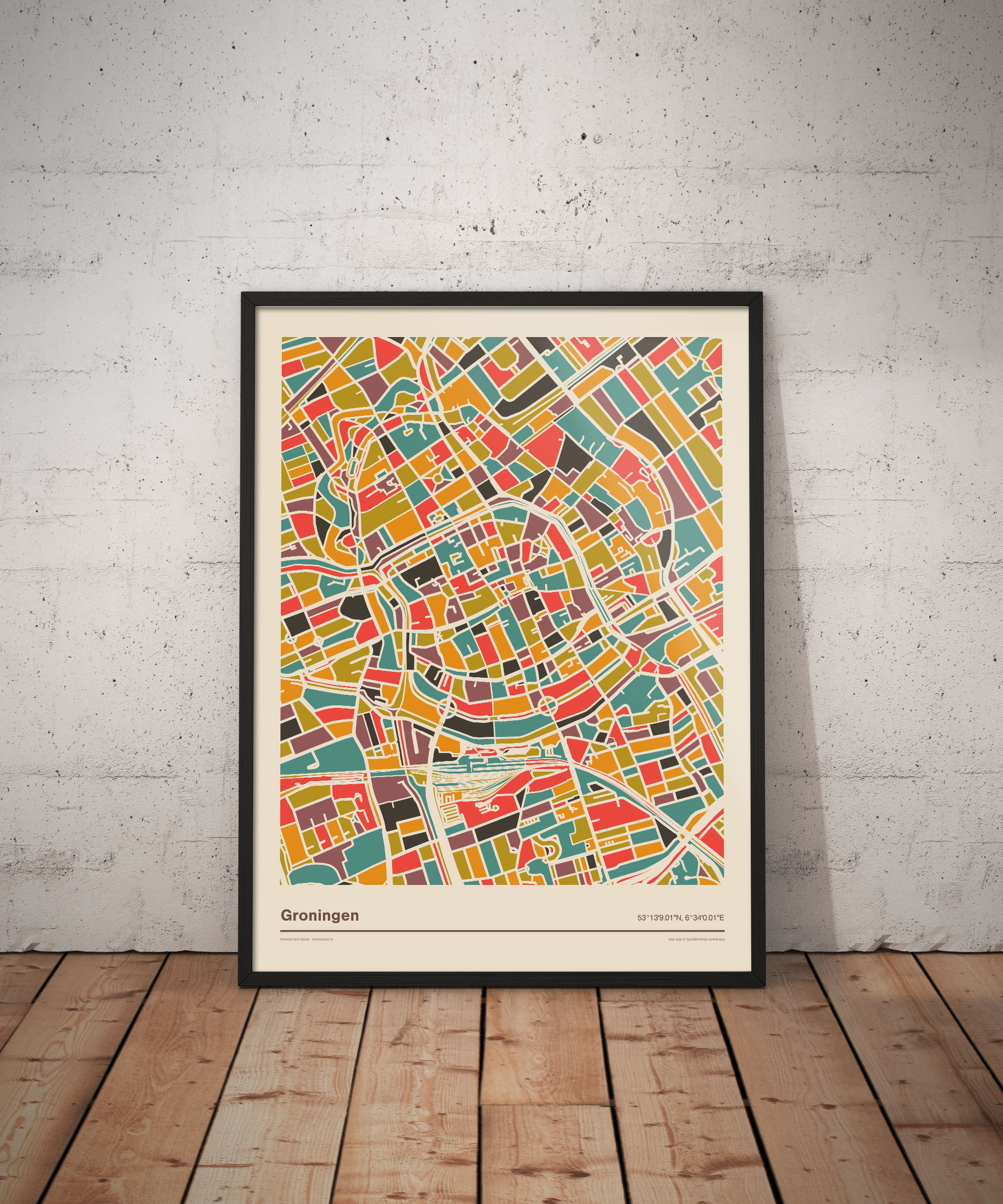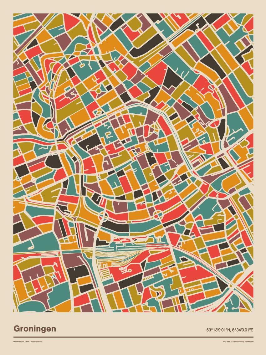 Mozaïek kaart/plattegrond van de stad Groningen in warme retro tinten. De kaart beslaat een deel van de stad. Met name het stadscentrum. Groningen is een oude studentenstad met een jonge bevolking. De jonge bevolking zorgt er voor dat er altijd wel iets te doen is in Groningen en maakt Groningen één van de meest creatieve steden van Nederland.