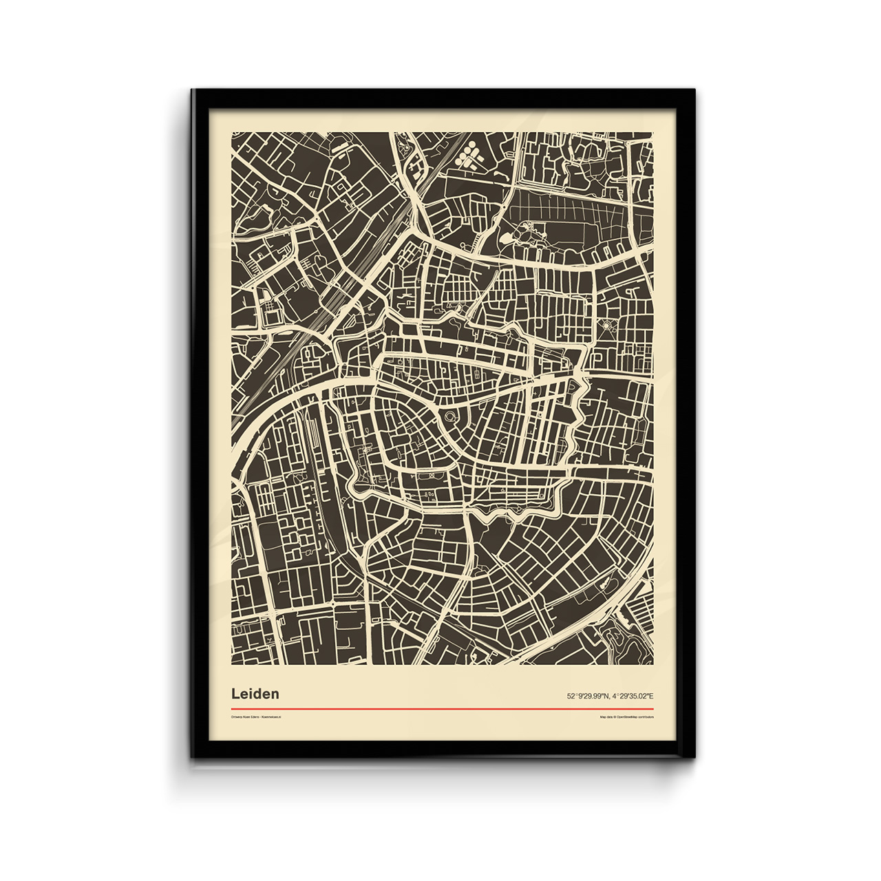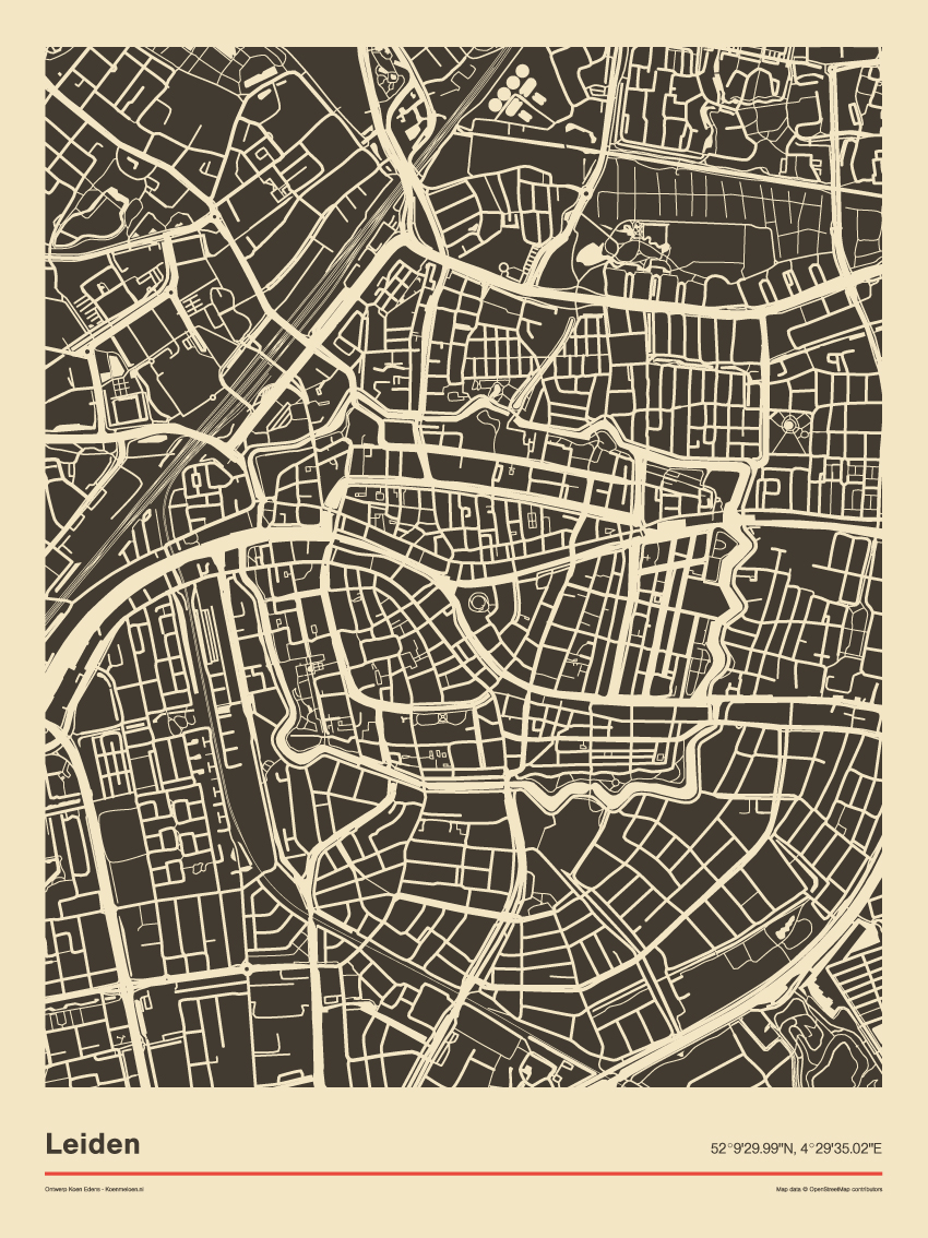 Zwart-wit poster van de stad Leiden met een vintage uitstraling. De kaart beslaat een deel van de stad. Met name het stadscentrum.