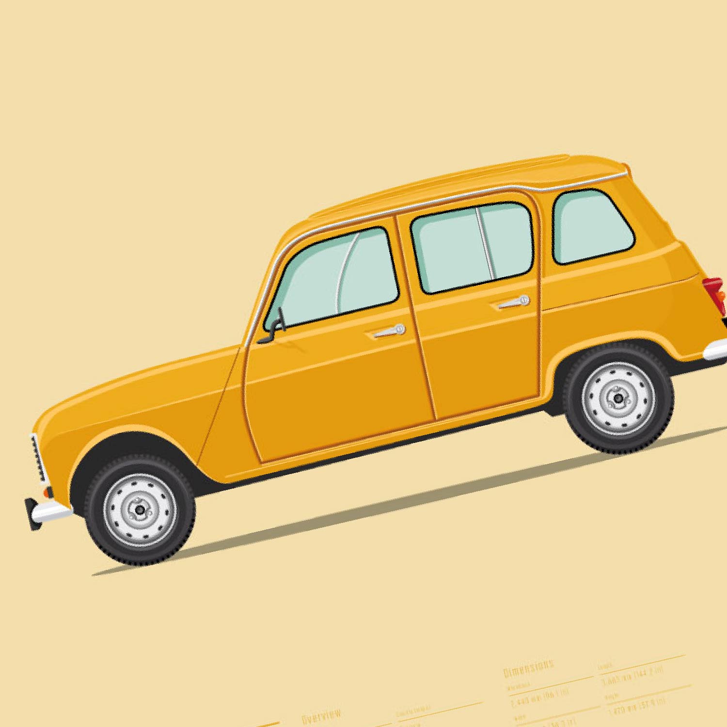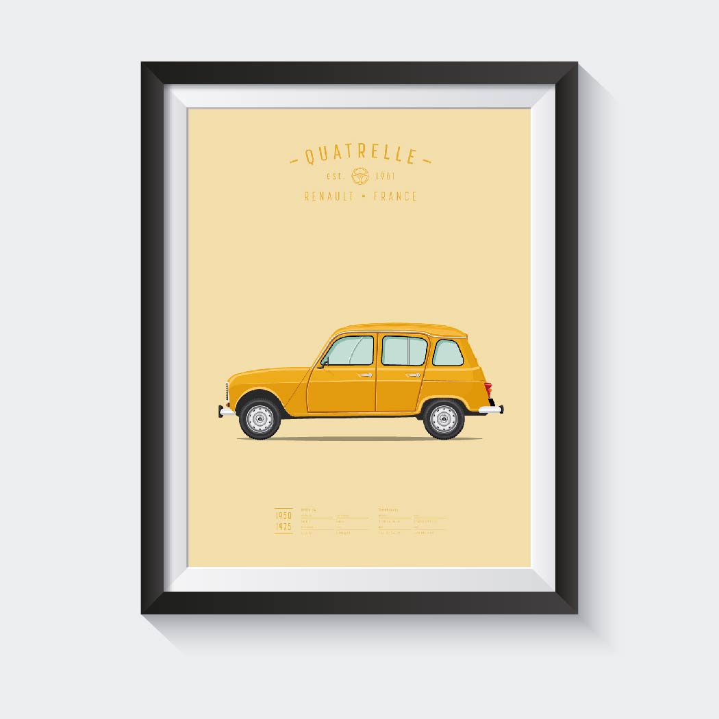 Mooie illustratie van een gele Renault 4 Quatrelle, gemaakt door Koenmeloen. Leuk voor de liefhebber, als decoratie in bijvoorbeeld je woonkamer en werkkamer.