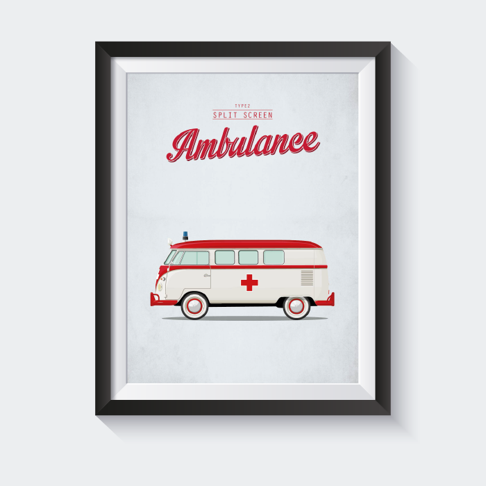 Mooie illustratie van een split screen, gemaakt door Koenmeloen. Iedereen kent de t1 bus. Maar er zijn zo veel andere leuke uitvoeringen van de bekende split screen. Dit is de “Ambulance”. Leuk voor de liefhebber, als decoratie in je woonkamer en werkkamer, maar staat natuurlijk ook erg leuk in een kinderkamer.
