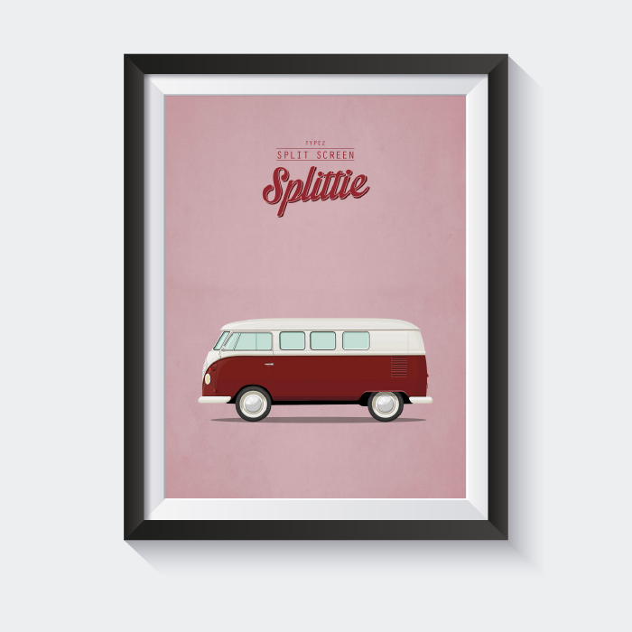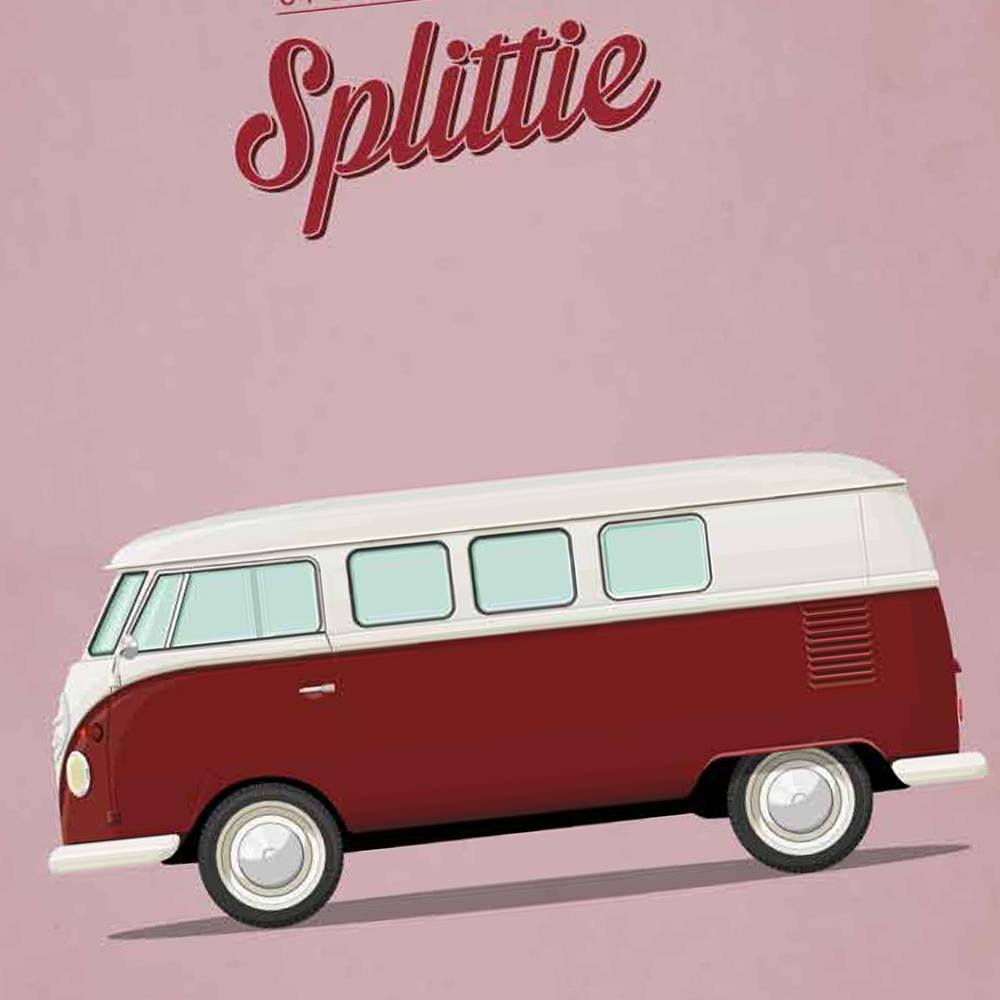 Mooie illustratie van een split screen, gemaakt door Koenmeloen. Iedereen kent de t1 bus. Maar er zijn zo veel andere leuke uitvoeringen van de bekende split screen. Dit is de “Splittie”. Leuk voor de liefhebber, als decoratie in je woonkamer en werkkamer, maar staat natuurlijk ook erg leuk in een kinderkamer.