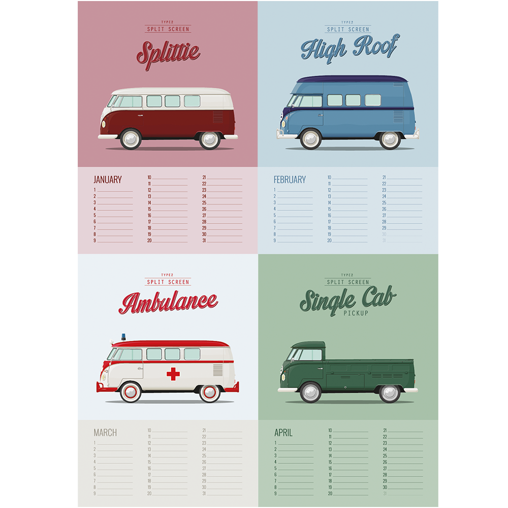 Een kleurrijke verjaardagskalender met voor elke maand een illustratie van een Split Screen Type 2 ook wel bekend als T1. De benaming Type 2 is afgeleid van de Kever. Deze werd namelijk Type 1 genoemd.